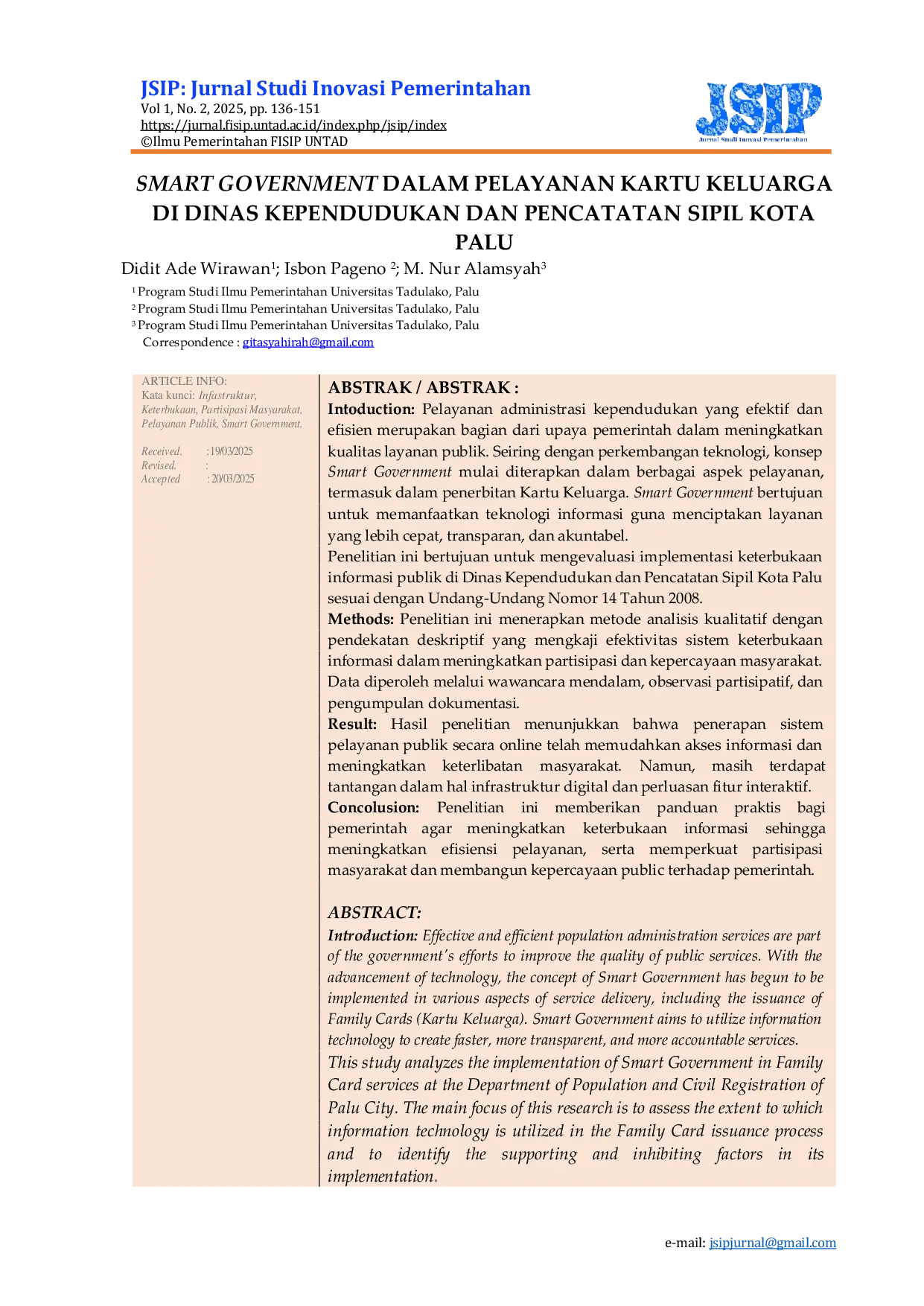 Jurnal Studi Inovasi PemerintahanJurnal Studi Inovasi PemerintahanIntoduction: Pelayanan administrasi kependudukan yang efektif dan efisien merupakan bagian dari upaya pemerintah dalam meningkatkan kualitas layanan publik. Seiring dengan perkembangan teknologi, konsep Smart Government mulai diterapkan dalam berbagai aspek pelayanan, termasuk dalam penerbitan Kartu Keluarga. Smart Government bertujuan untuk memanfaatkan teknologi informasi guna menciptakan layanan yang lebih cepat, transparan, dan akuntabel.. Penelitian ini bertujuan untuk mengevaluasi implementasi keterbukaan informasi publik di Dinas Kependudukan dan Pencatatan Sipil Kota Palu sesuai dengan Undang-Undang Nomor 14 Tahun 2008.. Methods: Penelitian ini menerapkan metode analisis kualitatif dengan pendekatan deskriptif yang mengkaji efektivitas sistem keterbukaan informasi dalam meningkatkan partisipasi dan kepercayaan masyarakat. Data diperoleh melalui wawancara mendalam, observasi partisipatif, dan pengumpulan dokumentasi.. Result: Hasil penelitian menunjukkan bahwa penerapan sistem pelayanan publik secara online telah memudahkan akses informasi dan meningkatkan keterlibatan masyarakat. Namun, masih terdapat tantangan dalam hal infrastruktur digital dan perluasan fitur interaktif.. Concolusion: Penelitian ini memberikan panduan praktis bagi pemerintah agar meningkatkan keterbukaan informasi sehingga meningkatkan efisiensi pelayanan, serta memperkuat partisipasi masyarakat dan membangun kepercayaan public terhadap pemerintah.