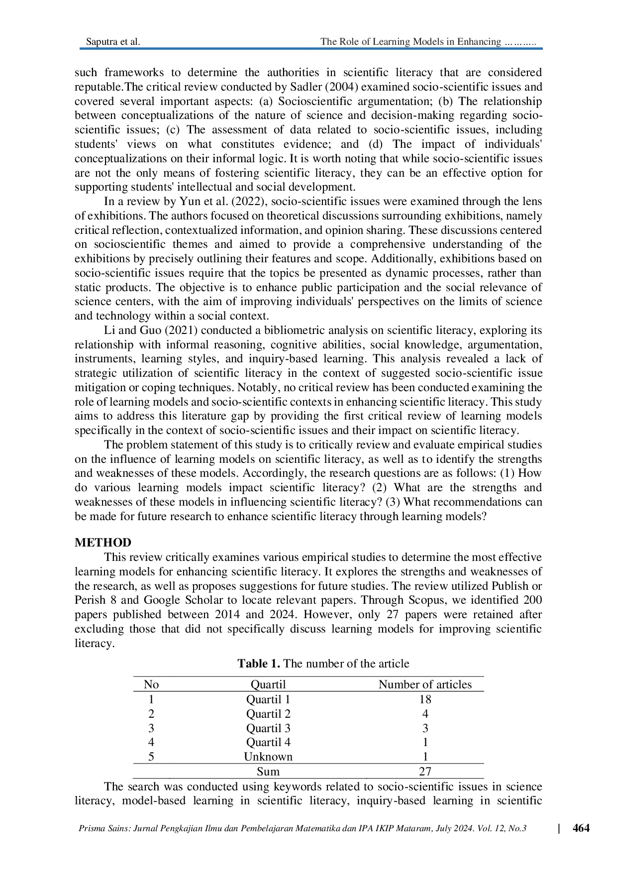 Prisma Sains : Jurnal Pengkajian Ilmu dan Pembelajaran Matematika dan IPA IKIP MataramPrisma Sains : Jurnal Pengkajian Ilmu dan Pembelajaran Matematika dan IPA IKIP MataramTinjauan literatur ini memeriksa dampak model pembelajaran terhadap literasi sains siswa dan memberikan kritik terhadap kekuatan dan kelemahan literatur. Kritik ini menawarkan rekomendasi untuk penelitian masa depan. Selain itu, tinjauan ini menganalisis peran isu-isu sosio-ilmiah dalam konteks literasi sains. Untuk melakukan tinjauan ini, 27 artikel dari jurnal-jurnal yang terindeks Scopus dianalisis secara kritis menggunakan kata kunci: (1) Isu-isu Sosio-Ilmiah dalam Literasi Sains, (2) Pembelajaran Berbasis Model dalam Literasi Sains, (3) Pembelajaran Berbasis Inquiry dalam Literasi Sains, dan (4) Isu-isu Sosio-Ilmiah menggunakan Pembelajaran Berbasis Model dalam Literasi Sains. Analisis difasilitasi oleh perangkat lunak Publish or Perish. Temuan tinjauan ini menunjukkan bahwa berbagai model pembelajaran berbasis inquiry memiliki dampak positif terhadap literasi sains di berbagai topik dan mendukung pencapaian belajar siswa. Namun, diamati bahwa dua jenis tertentu dari model pembelajaran berbasis inquiry, yaitu pembelajaran berbasis inquiry terbuka dan pembelajaran berbasis inquiry independen, tidak efektif dalam meningkatkan literasi sains. Oleh karena itu, penelitian masa depan harus fokus pada model pembelajaran berbasis inquiry alternatif yang menunjukkan hasil menjanjikan dalam meningkatkan literasi sains. Selain itu, tinjauan ini menekankan bahwa literatur yang ada sebagian besar membahas isu-isu sosio-ilmiah dalam kerangka pengaturan kurikulum dan tidak cukup membahas masalah kehidupan nyata yang terkait dengan isu-isu ini.