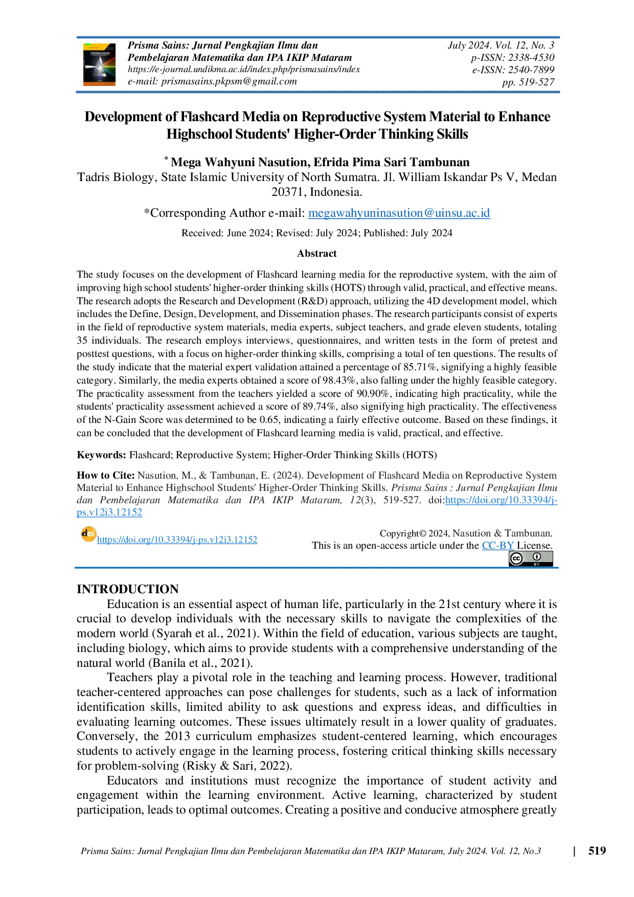 Prisma Sains : Jurnal Pengkajian Ilmu dan Pembelajaran Matematika dan IPA IKIP MataramPrisma Sains : Jurnal Pengkajian Ilmu dan Pembelajaran Matematika dan IPA IKIP MataramThe study focuses on the development of Flashcard learning media for the reproductive system, with the aim of improving high school students higher-order thinking skills (HOTS) through valid, practical, and effective means. The research adopts the Research and Development (R&D) approach, utilizing the 4D development model, which includes the Define, Design, Development, and Dissemination phases. The research participants consist of experts in the field of reproductive system materials, media experts, subject teachers, and grade eleven students, totaling 35 individuals. The research employs interviews, questionnaires, and written tests in the form of pretest and posttest questions, with a focus on higher-order thinking skills, comprising a total of ten questions. The results of the study indicate that the material expert validation attained a percentage of 85.71%, signifying a highly feasible category. Similarly, the media experts obtained a score of 98.43%, also falling under the highly feasible category. The practicality assessment from the teachers yielded a score of 90.90%, indicating high practicality, while the students practicality assessment achieved a score of 89.74%, also signifying high practicality. The effectiveness of the N-Gain Score was determined to be 0.65, indicating a fairly effective outcome. Based on these findings, it can be concluded that the development of Flashcard learning media is valid, practical, and effective.