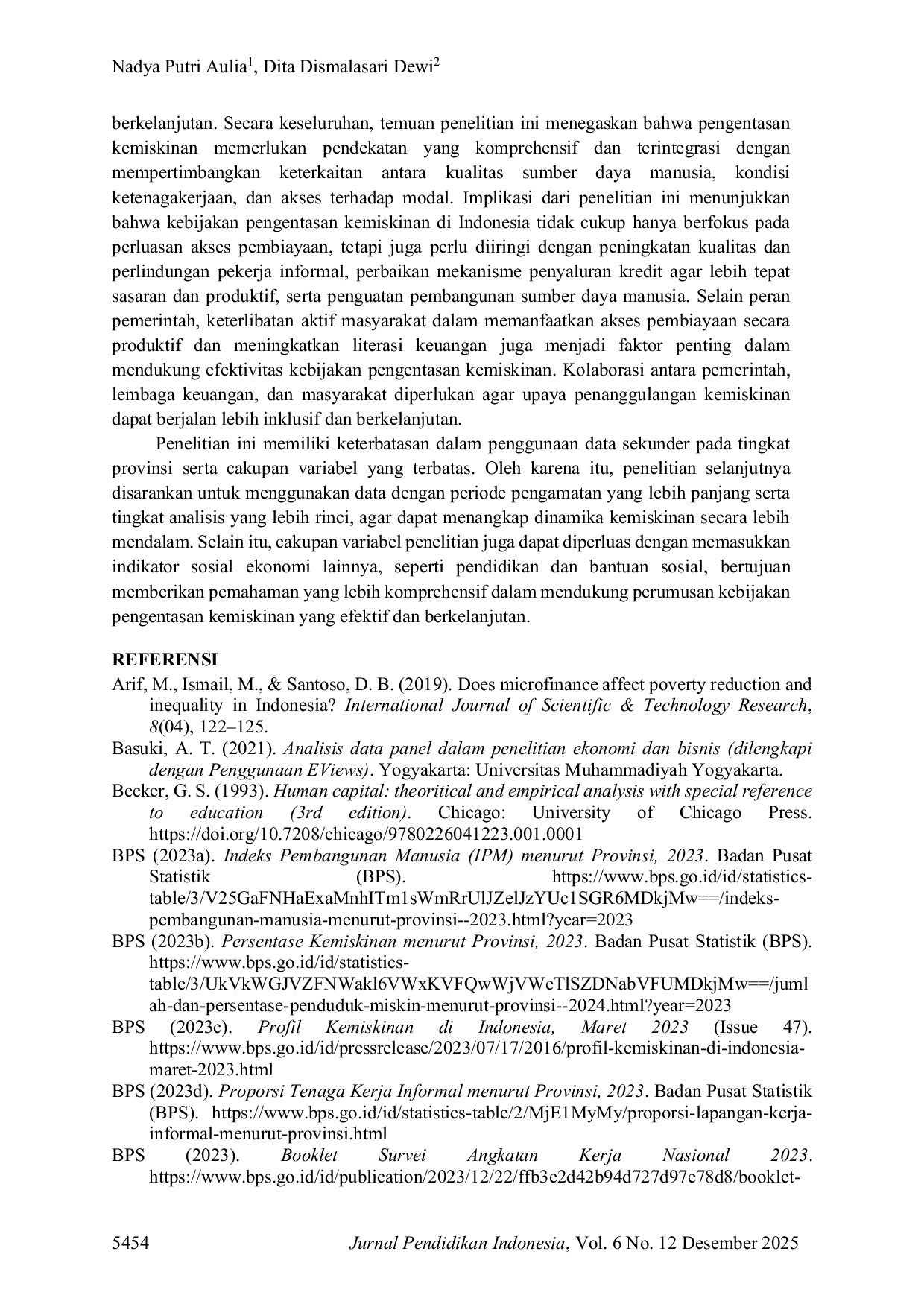 Berdasarkan hasil analisis regresi data panel pada 34 provinsi di Indonesia selama periode 2019-2023, penelitian ini menyimpulkan bahwa pekerja informal dan kredit Bank Perkreditan Rakyat (BPR) berpengaruh positif dan signifikan terhadap tingkat kemiskinan, sedangkan Indeks Pembangunan Manusia (IPM) berpengaruh negatif dan signifikan.Temuan ini menunjukkan bahwa tingginya proporsi pekerja informal yang dicirikan oleh pendapatan rendah, ketidakstabilan kerja, serta minimnya perlindungan sosial berkontribusi terhadap peningkatan kemiskinan.Selain itu, penyaluran kredit BPR yang belum sepenuhnya tepat sasaran dan cenderung dimanfaatkan untuk tujuan nonproduktif berpotensi memperkuat kerentanan ekonomi masyarakat berpenghasilan rendah, sehingga belum efektif dalam menurunkan kemiskinan.Sebaliknya, peningkatan kualitas pembangunan manusia yang tercermin melalui IPM terbukti berperan dalam menekan tingkat kemiskinan.Perbaikan kualitas sumber daya manusia melalui peningkatan pendidikan, kesehatan, dan produktivitas tenaga kerja mampu memperkuat kapasitas ekonomi individu serta membantu masyarakat keluar dari lingkaran kemiskinan secara berkelanjutan.Secara keseluruhan, temuan penelitian ini menegaskan bahwa pengentasan kemiskinan memerlukan pendekatan yang komprehensif dan terintegrasi dengan mempertimbangkan keterkaitan antara kualitas sumber daya manusia, kondisi ketenagakerjaan, dan akses terhadap modal.Implikasi dari penelitian ini menunjukkan bahwa kebijakan pengentasan kemiskinan di Indonesia tidak cukup hanya berfokus pada perluasan akses pembiayaan, tetapi juga perlu diiringi dengan peningkatan kualitas dan perlindungan pekerja informal, perbaikan mekanisme penyaluran kredit agar lebih tepat sasaran dan produktif, serta penguatan pembangunan sumber daya manusia.