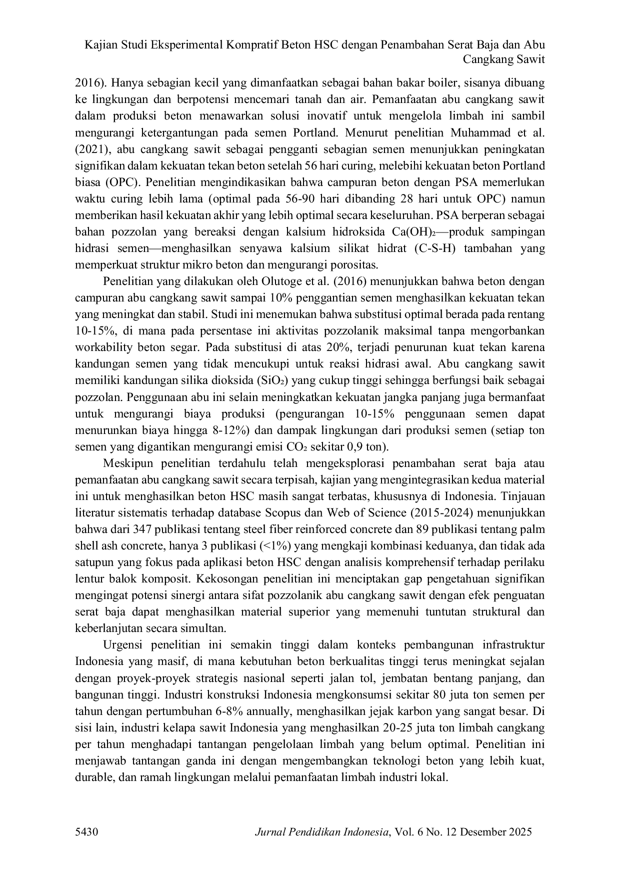 Jurnal Pendidikan IndonesiaJurnal Pendidikan IndonesiaPenelitian ini bertujuan untuk menganalisis pengaruh penggunaan abu cangkang sawit (ACS) sebagai bahan pengganti 15% semen dan penambahan serat baja 2% terhadap sifat mekanis beton mutu tinggi (High Strength Concrete/HSC). Pengujian meliputi uji beton segar (slump flow, T50 time, V-funnel, L-box) dan beton keras (kuat tekan, kuat tarik belah, kuat lentur). Hasil menunjukkan seluruh parameter beton segar memenuhi standar EFNARC untuk Self-Compacting Concrete (SCC). Kuat tekan meningkat signifikan dari 30,89 MPa (beton normal) menjadi 90,25 MPa (HSC)—peningkatan 192% atau 65,7% lebih tinggi dari target mutu. Kuat tarik belah meningkat dari 2,95 MPa menjadi 5,63 MPa (90,8%), sedangkan kuat lentur meningkat dari 6,27 MPa menjadi 16,69 MPa (166%) pada balok komposit dengan lapisan HSC 5 cm. Peningkatan ini disebabkan oleh reaksi pozzolanik abu cangkang sawit yang menghasilkan kalsium silikat hidrat (C-S-H) tambahan dan kontribusi serat baja dalam menahan propagasi retak serta meningkatkan daktilitas. Analisis displacement menunjukkan peningkatan ketebalan lapisan HSC meningkatkan kekakuan lentur dan menurunkan lendutan maksimum. Kombinasi ACS 15% dan serat baja 2% terbukti efektif meningkatkan performa mekanis dan struktural beton hingga tiga kali lipat dibandingkan beton normal, sekaligus mendukung material ramah lingkungan dalam teknologi beton modern dengan memanfaatkan limbah industri kelapa sawit.