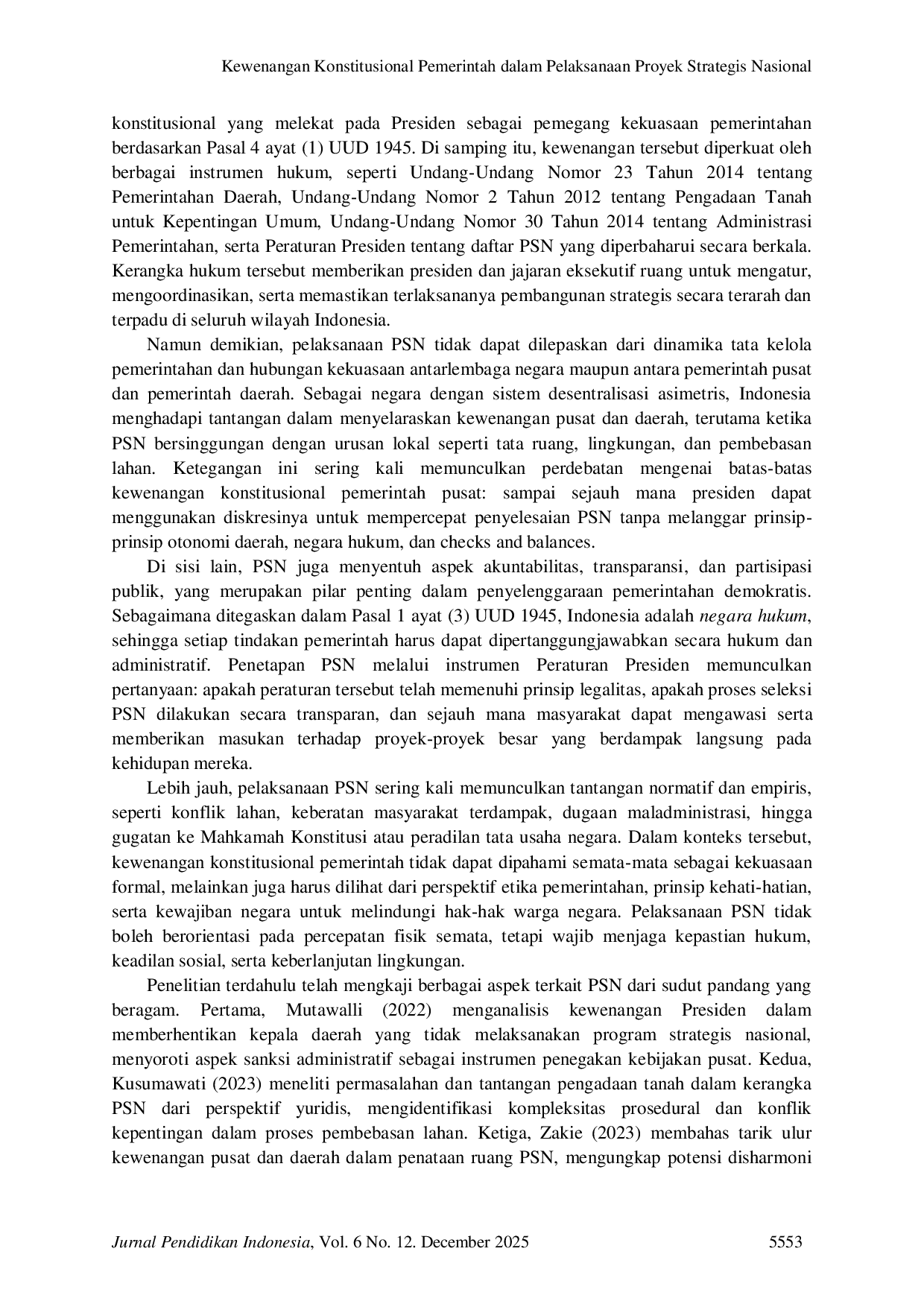 Jurnal Pendidikan IndonesiaJurnal Pendidikan IndonesiaPSN merupakan instrumen percepatan pembangunan yang diatur melalui berbagai regulasi, termasuk UUD 1945, UU Pemerintahan Daerah, serta Peraturan Presiden tentang PSN. Namun, perlu ditinjau sejauh mana kewenangan konstitusional pemerintah dapat digunakan tanpa melampaui prinsip checks and balances. Penelitian ini bertujuan untuk menganalisis (PSN) dengan meninjau dasar hukum, cakupan kewenangan eksekutif, serta implikasinya terhadap tata kelola pembangunan nasional. Penelitian menggunakan metode studi kepustakaan melalui analisis konstitusi, peraturan perundang-undangan, putusan Mahkamah Konstitusi, serta literatur akademik terkait kewenangan eksekutif dan hukum administrasi. Temuan menunjukkan bahwa pemerintah memiliki legitimasi konstitusional untuk menjalankan PSN berdasarkan fungsi eksekutif dan mandat pembangunan nasional. Namun, kewenangan tersebut dibatasi oleh prinsip otonomi daerah, akuntabilitas publik, dan pengawasan yudisial. Pelaksanaan PSN efektif ketika didukung koordinasi lintas lembaga dan penegakan prinsip good governance. Namun, potensi konflik kewenangan, sentralisasi keputusan, dan kurangnya partisipasi publik dapat menimbulkan persoalan implementatif. Studi ini menegaskan pentingnya harmonisasi kewenangan pusat-daerah, transparansi prosedural, serta penguatan mekanisme pengawasan agar pelaksanaan PSN tetap sejalan dengan prinsip negara hukum.