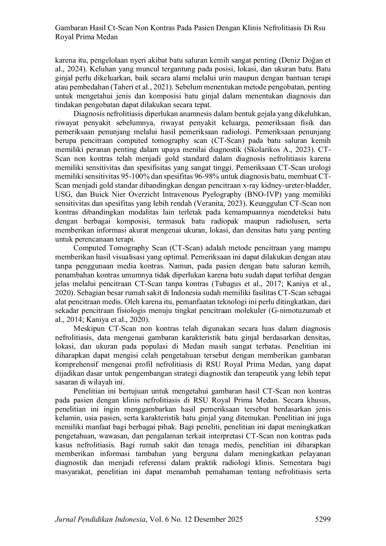 Jurnal Pendidikan IndonesiaJurnal Pendidikan IndonesiaNefrolitiasis merupakan salah satu gangguan saluran kemih yang paling sering ditemukan dan ditandai dengan pembentukan batu pada sistem urinarius. Pemeriksaan CT-Scan non kontras saat ini menjadi modalitas pencitraan yang paling akurat dalam menilai karakteristik batu ginjal, termasuk ukuran, lokasi, dan densitasnya. Penelitian ini bertujuan untuk menggambarkan hasil CT-Scan non kontras pada pasien dengan klinis nefrolitiasis di RSU Royal Prima Medan. Penelitian menggunakan desain deskriptif retrospektif dengan pendekatan cross-sectional. Data diperoleh dari rekam medis pasien yang menjalani pemeriksaan CT-Scan non kontras selama Januari–Desember 2024. Total sampel berjumlah 35 pasien yang memenuhi kriteria inklusi. Hasil penelitian menunjukkan bahwa mayoritas pasien berjenis kelamin laki-laki yaitu 24 orang (68,6%), sedangkan perempuan sebanyak 11 orang (31,4%). Berdasarkan kelompok usia, penderita terbanyak berada pada rentang usia 51–60 tahun, yaitu 17 pasien (48,6%). Karakteristik batu ginjal berdasarkan ukuran menunjukkan bahwa kelompok ukuran 5–10 mm dan 10–20 mm merupakan yang paling dominan, masing-masing 11 pasien (31,4%). Berdasarkan letak batu, kaliks menjadi lokasi tersering (42,9%), diikuti ureter (28,6%) dan pelvis (22,9%). Sementara itu, densitas batu terbanyak berada pada kategori <450 HU, yaitu 17 pasien (48,6%), yang mengindikasikan kecenderungan batu dengan densitas rendah. Hasil penelitian ini menegaskan bahwa CT-Scan non kontras merupakan alat diagnostik yang efektif untuk menilai gambaran batu ginjal secara komprehensif. Informasi mengenai ukuran, densitas, dan lokasi batu sangat penting untuk menentukan rencana terapi yang tepat serta memprediksi keberhasilan metode penatalaksanaan seperti ESWL maupun tindakan intervensi lainnya.