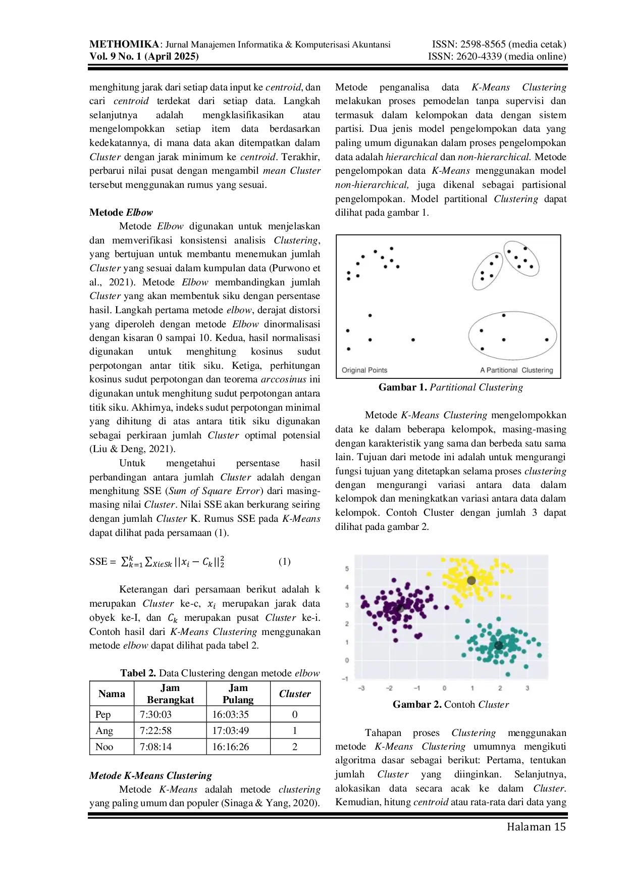 Penelitian selanjutnya dapat mengeksplorasi penggunaan indikator tambahan seperti kepatuhan terhadap peraturan internal dan tanggung jawab pekerjaan untuk memperkaya penilaian kedisiplinan pegawai, sehingga model klasifikasi menjadi lebih komprehensif. Selain itu, studi lanjutan dapat membandingkan efektivitas algoritma clustering lain, misalnya DBSCAN atau Hierarchical Clustering, dalam mengelompokkan data kehadiran untuk menentukan apakah metode K-Means memang paling optimal dalam konteks ini. Penelitian juga dapat mengembangkan sistem pemantauan kedisiplinan secara real‑time dengan integrasi data kehadiran, output kerja, dan feedback supervisor, guna menguji dampak disiplin terhadap produktivitas dan kepuasan kerja secara longitudinal. Dengan pendekatan multidimensi tersebut, hasilnya diharapkan memberikan wawasan yang lebih akurat bagi manajemen dalam merumuskan kebijakan pengembangan sumber daya manusia.