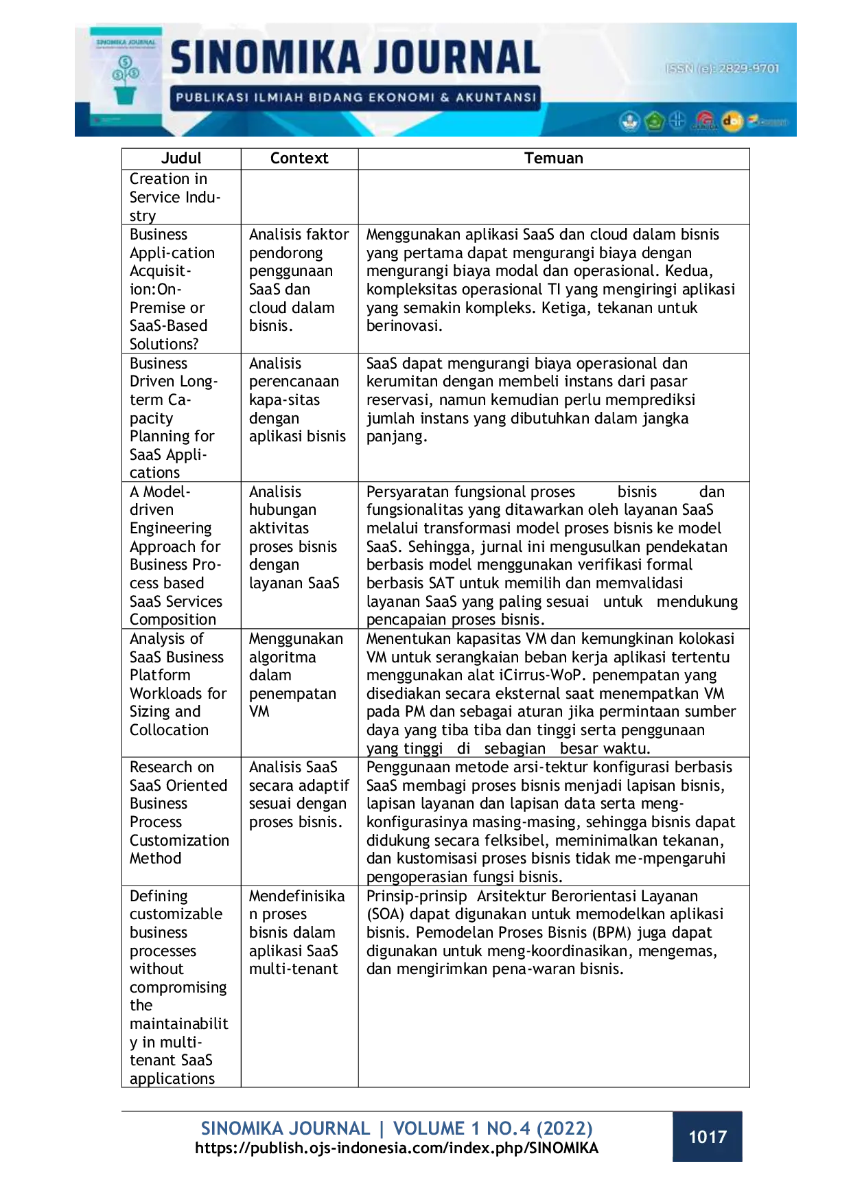 SINOMIKA Journal: Publikasi Ilmiah Bidang Ekonomi dan AkuntansiSINOMIKA Journal: Publikasi Ilmiah Bidang Ekonomi dan AkuntansiKeberadaan komputasi awan jelas akan menimbulkan perubahan dalam cara kerja sistem teknologi informasi dalam suatu bisnis. Hal ini dikarenakan komputasi awan melalui konsep virtualisasi, standarisasi dan fitur mendasar lainnya yang dapat mengurangi biaya, menyederhanakan pengelolaan informasi dan mempercepat penghantaran layanan. Salah satu infrastruktur komputasi awan yaitu Software as a Service (SaaS) saat ini menjadi pilihan bagi banyak perusahaan yang sedang mengembangkan bisnisnya terutama pada bisnis E-Commerce. Sebagai bentuk tipikal layanan cloud, SaaS telah memimpin adopsi cloud untuk mengaktifkan E-Commerce oleh industri. Pengembangan kerangka kerja untuk memodelkan sistem bisnis yang kompleks sebagai model SaaS di Cloud telah terbukti sangat efektif. Literatur review dilakukan berdasarkan issue, metodologi, dan persamaan. Dari 12 penelitian yang dilakukan disajikan beberapa metode yang digunakan dengan algoritma yang sesuai dengan permasalahan yang ada. Berdasarkan 12 penelitian didapatkan bahwa terdapat beberapa faktor yang mendorong penggunaan SaaS dan cloud secara umum pada proses bisnis yang tersebar di beberapa negara. Dalam salah satu penelitian terdapat satu metode yang digunakan untuk mendukung proses bisnis yang berorientasi dengan SaaS. Diskusi : Penerapan model SaaS pada proses bisnis E-Commerce memberikan peran penting dan sangat menguntungkan dalam memberikan layanan kepada pelanggan.