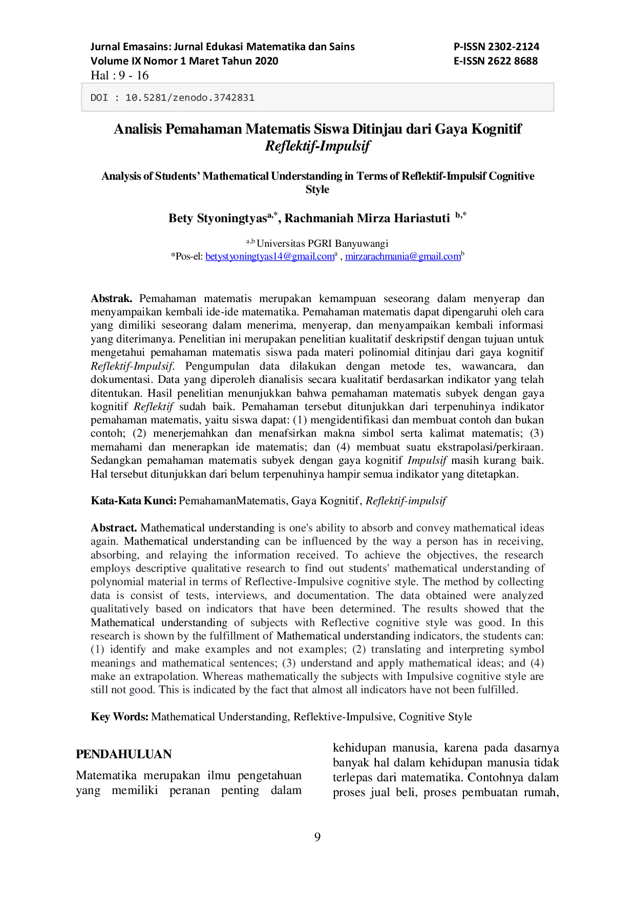 Emasains : Jurnal Edukasi Matematika dan SainsEmasains : Jurnal Edukasi Matematika dan SainsPemahaman matematis merupakan kemampuan seseorang dalam menyerap dan menyampaikan kembali ide-ide matematika. Pemahaman matematis dapat dipengaruhi oleh cara yang dimiliki seseorang dalam menerima, menyerap, dan menyampaikan kembali informasi yang diterimanya. Penelitian ini merupakan penelitian kualitatif deskriptif dengan tujuan untuk mengetahui pemahaman matematis siswa pada materi polinomial ditinjau dari gaya kognitif Reflektif-Impulsif. Pengumpulan data dilakukan dengan metode tes, wawancara, dan dokumentasi. Data yang diperoleh dianalisis secara kualitatif berdasarkan indikator yang telah ditentukan. Hasil penelitian menunjukkan bahwa pemahaman matematis subyek dengan gaya kognitif Reflektif sudah baik. Pemahaman tersebut ditunjukkan dari terpenuhinya indikator pemahaman matematis, yaitu siswa dapat: (1) mengidentifikasi dan membuat contoh dan bukan contoh; (2) menerjemahkan dan menafsirkan makna simbol serta kalimat matematis; (3) memahami dan menerapkan ide matematis; dan (4) membuat suatu ekstrapolasi/perkiraan. Sedangkan pemahaman matematis subyek dengan gaya kognitif Impulsif masih kurang baik. Hal tersebut ditunjukkan dari belum terpenuhinya hampir semua indikator yang ditetapkan.