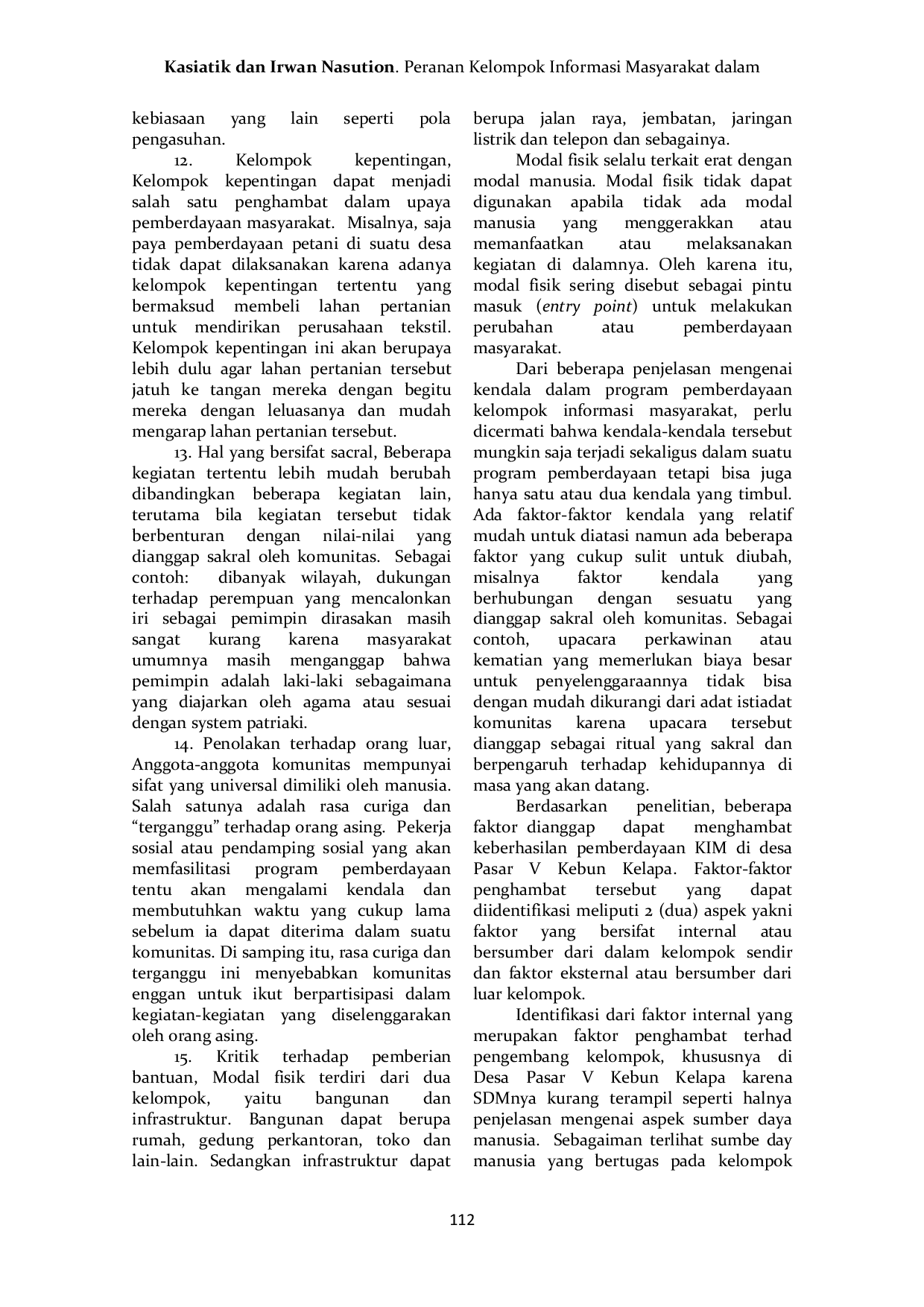 JPPUMA: Journal of Governmental and Political Science University of Medan AreaJPPUMA: Journal of Governmental and Political Science University of Medan AreaPenelitian ini bertujuan untuk mendeskripsikan, serta menganalisis Peranan Kelompok Informasi Masyarakat dalam mewujudkan Desa Mandiri serta kendala-kendala yang dihadapi oleh Kelompok Informasi Masyarakat Desa Pasar V Kebun Kelapa Kecamatan Beringin Kabupaten Deli Serdang. Masyarakat Desa Pasar V Kebun Kelapa memiliki jenjang pendidikan yang rendah. Dari hasil penelitian diketahui bahwa peran Kelompok Informasi Masyarkat (KIM) Desa Pasar V Kebun Kelapa hingga saat ini belum berjalan dengan baik. Kemiskinan merupakan salah satu persoalan mendasar saat ini. Kelompok Informasi Masyarakat memiliki peran yang dapat dikelompokkan ke dalam lima kegiatan yaitu: Sebagai fasilitator bagi masyarakat, sebagai mitra pemerintah daerah, sebagai penyerap dan penyalur aspirasi masyarakat, sebagai pelancaraan arus informasi, dan sebagai terminal informasi bagi masyarakat. Dengan menggunakan metode analisis kualitatif, yaitu dengan cara menggambarkan atau melukiskan secara sistematis, faktual dan akurat mengenai fakta-fakta, sifat-sifat serta hubungan yang diselidiki diharapkan akan terwujud masyarakat yang aktif dan peka akan informasi, serta menciptakan jaringan informasi media komunikasi dua arah dengan menghubungkan satu kelompok masyarakat dengan kelompok lainnya agar bisa saling memberdayakan.