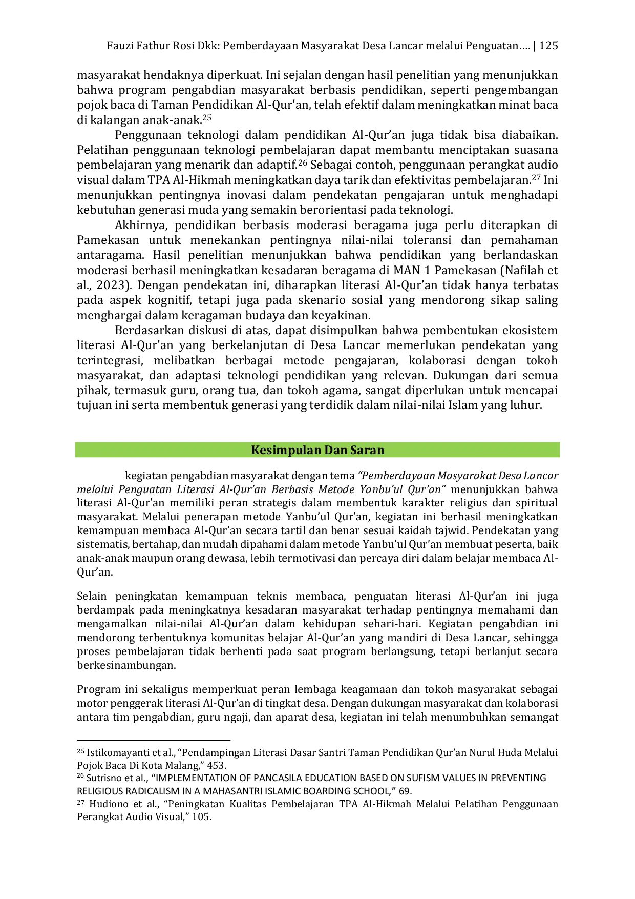Kegiatan pengabdian masyarakat dengan tema “Pemberdayaan Masyarakat Desa Lancar melalui Penguatan Literasi Al-Quran Berbasis Metode Yanbuul Quran menunjukkan bahwa literasi Al-Quran memiliki peran strategis dalam membentuk karakter religius dan spiritual masyarakat.Melalui penerapan metode Yanbuul Quran, kegiatan ini berhasil meningkatkan kemampuan membaca Al-Quran secara tartil dan benar sesuai kaidah tajwid.Pendekatan yang sistematis, bertahap, dan mudah dipahami dalam metode Yanbuul Quran membuat peserta, baik anak-anak maupun orang dewasa, lebih termotivasi dan percaya diri dalam belajar membaca Al-Quran.Selain peningkatan kemampuan teknis membaca, penguatan literasi Al-Quran ini juga berdampak pada meningkatnya kesadaran masyarakat terhadap pentingnya memahami dan mengamalkan nilai-nilai Al-Quran dalam kehidupan sehari-hari.Kegiatan pengabdian ini mendorong terbentuknya komunitas belajar Al-Quran yang mandiri di Desa Lancar, sehingga proses pembelajaran tidak berhenti pada saat program berlangsung, tetapi berlanjut secara berkelanjutan.Program ini sekaligus memperkuat peran lembaga keagamaan dan tokoh masyarakat sebagai motor penggerak literasi Al-Quran di tingkat desa.Dengan dukungan masyarakat dan kolaborasi antara tim pengabdian, guru ngaji, dan aparat desa, kegiatan ini telah menumbuhkan semangat kebersamaan dalam membangun generasi Qurani.Oleh karena itu, penguatan literasi Al-Quran berbasis metode Yanbuul Quran terbukti menjadi strategi efektif dalam memberdayakan masyarakat Desa Lancar menuju kehidupan religius yang lebih berkualitas dan berakhlak mulia.