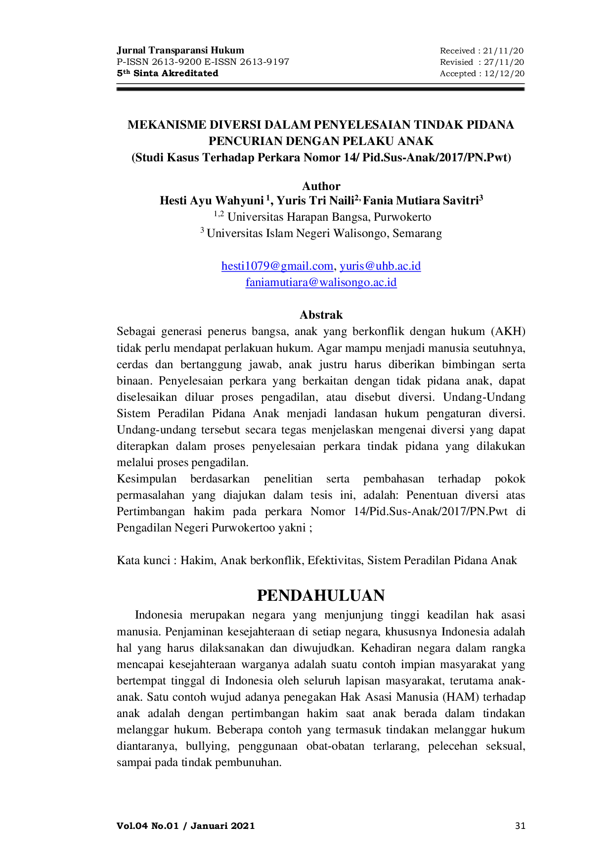Transparansi HukumTransparansi HukumSebagai generasi penerus bangsa, anak yang berkonflik dengan hukum (AKH) tidak perlu mendapat perlakuan hukum. Agar mampu menjadi manusia seutuhnya, cerdas dan bertanggung jawab, anak justru harus diberikan bimbingan serta binaan. Penyelesaian perkara yang berkaitan dengan tidak pidana anak dapat diselesaikan di luar proses pengadilan, atau disebut diversi. Undang-Undang Sistem Peradilan Pidana Anak menjadi landasan hukum pengaturan diversi. Undang-undang tersebut secara tegas menjelaskan mengenai diversi yang dapat diterapkan dalam proses penyelesaian perkara tindak pidana yang dilakukan melalui proses pengadilan.