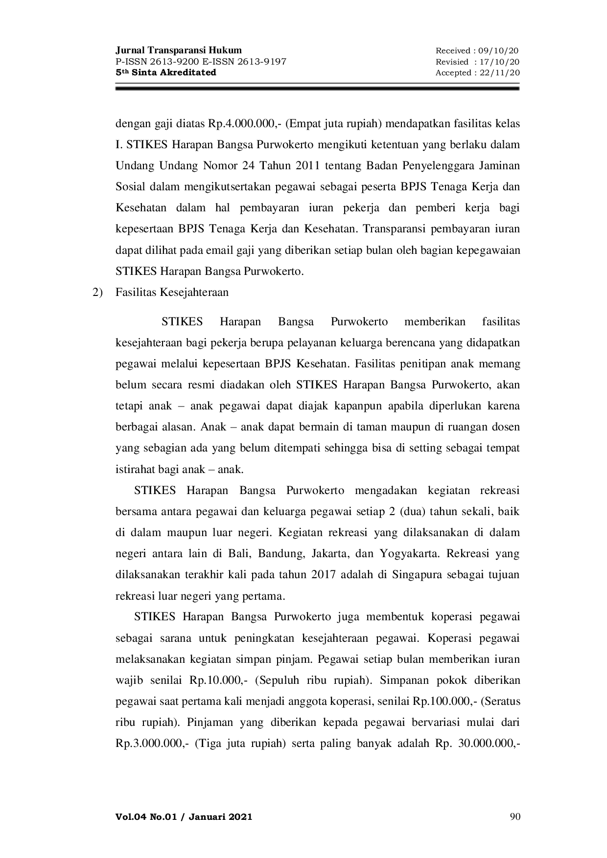 Penelitian menunjukkan bahwa STIKES Harapan Bangsa Purwokerto telah melaksanakan perlindungan pekerja sesuai dengan peraturan kepegawaian, termasuk perlindungan waktu kerja, cuti melahirkan, dan keselamatan kesehatan.Pengupahan diatur jelas dengan struktur gaji yang memenuhi upah minimum regional, serta kesejahteraan diberikan melalui jaminan sosial BPJS, fasilitas kesehatan, dan koperasi pegawai.Namun, masih terdapat kekurangan, khususnya belum diaturnya cuti haid bagi pekerja perempuan dalam peraturan kepegawaian.