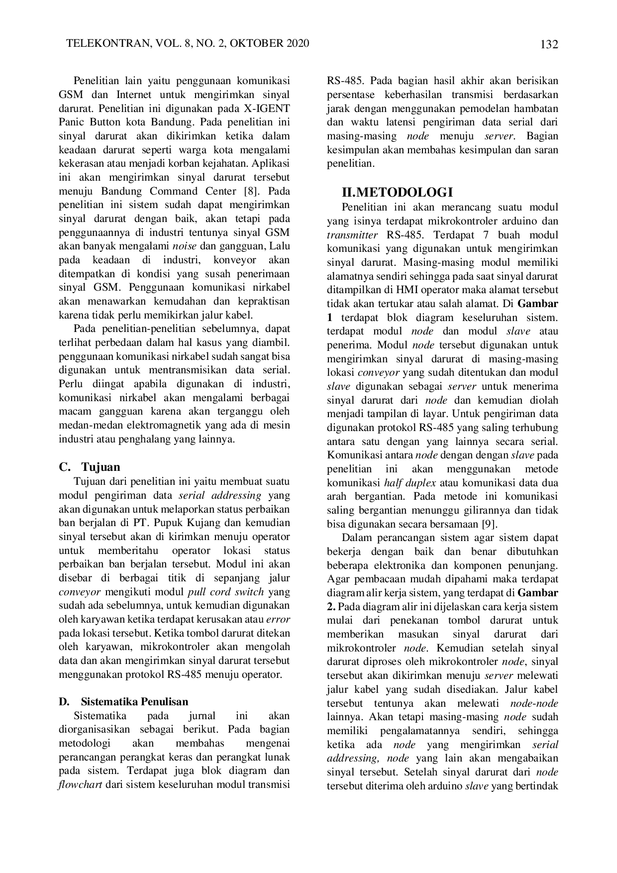 Telekontran : Jurnal Ilmiah Telekomunikasi, Kendali dan Elektronika TerapanTelekontran : Jurnal Ilmiah Telekomunikasi, Kendali dan Elektronika TerapanKonveyor atau dapat disebut ban berjalan merupakan alat yang banyak digunakan di berbagai macam industri. Umumnya konveyor berfungsi sebagai alat pembawa bahan-bahan industri dari titik A menuju titik B untuk diproses. Penelitian ini difokuskan pada pembuatan sistem proteksi pada konveyor industri yang dapat memberikan informasi lokasi terjadinya status perbaikan ban berjalan, menambah keamanan pada saklar kabel darurat yang ada, serta mengirimkan sinyal darurat berupa serial addressing ke komputer operator. Pengujian menunjukkan bahwa transmisi data menggunakan RS‑485 berhasil hingga jarak 2453 m tanpa cacat, dengan waktu pengiriman data rata‑rata 1047,7 ms, sehingga sistem dapat mengirimkan sinyal lokasi perbaikan secara tepat pada PT Pupuk Kujang.