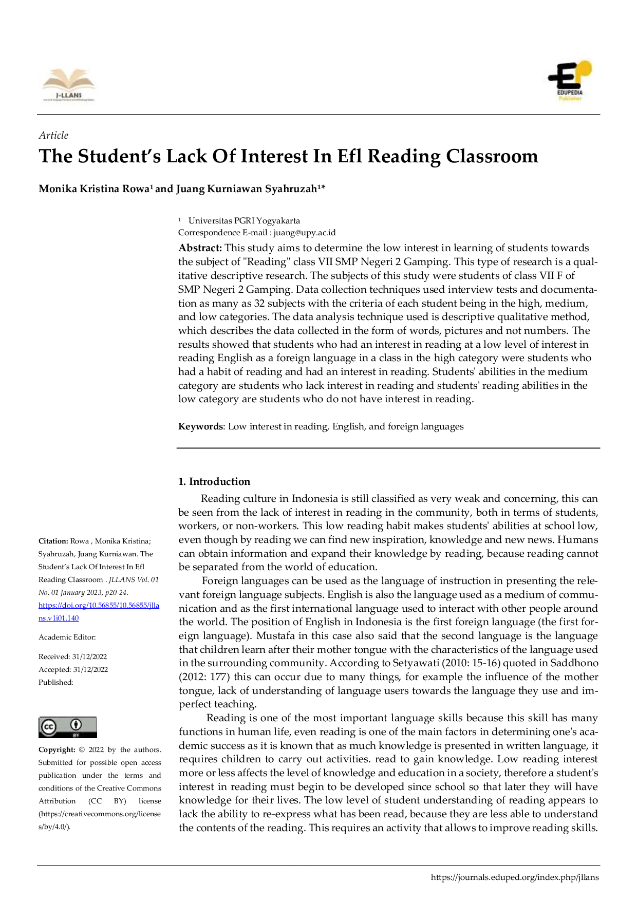 Journal of Literature Language and Academic StudiesJournal of Literature Language and Academic StudiesStudi ini bertujuan untuk menentukan minat rendah siswa terhadap mata pelajaran Membaca kelas VII SMP Negeri 2 Gamping. Jenis penelitian ini adalah penelitian deskriptif kualitatif. Subjek penelitian ini adalah siswa kelas VII F SMP Negeri 2 Gamping. Teknik pengumpulan data yang digunakan adalah tes wawancara dan dokumentasi sebanyak 32 subjek dengan kriteria setiap siswa berada dalam kategori tinggi, sedang, dan rendah. Teknik analisis data yang digunakan adalah metode kualitatif deskriptif, yang menggambarkan data yang dikumpulkan dalam bentuk kata-kata, gambar, dan bukan angka. Hasil menunjukkan bahwa siswa yang memiliki minat membaca pada tingkat rendah memiliki kebiasaan membaca dan minat membaca. Kemampuan siswa pada kategori sedang adalah siswa yang kurang minat membaca, sedangkan kemampuan siswa pada kategori rendah adalah siswa yang tidak memiliki minat membaca.