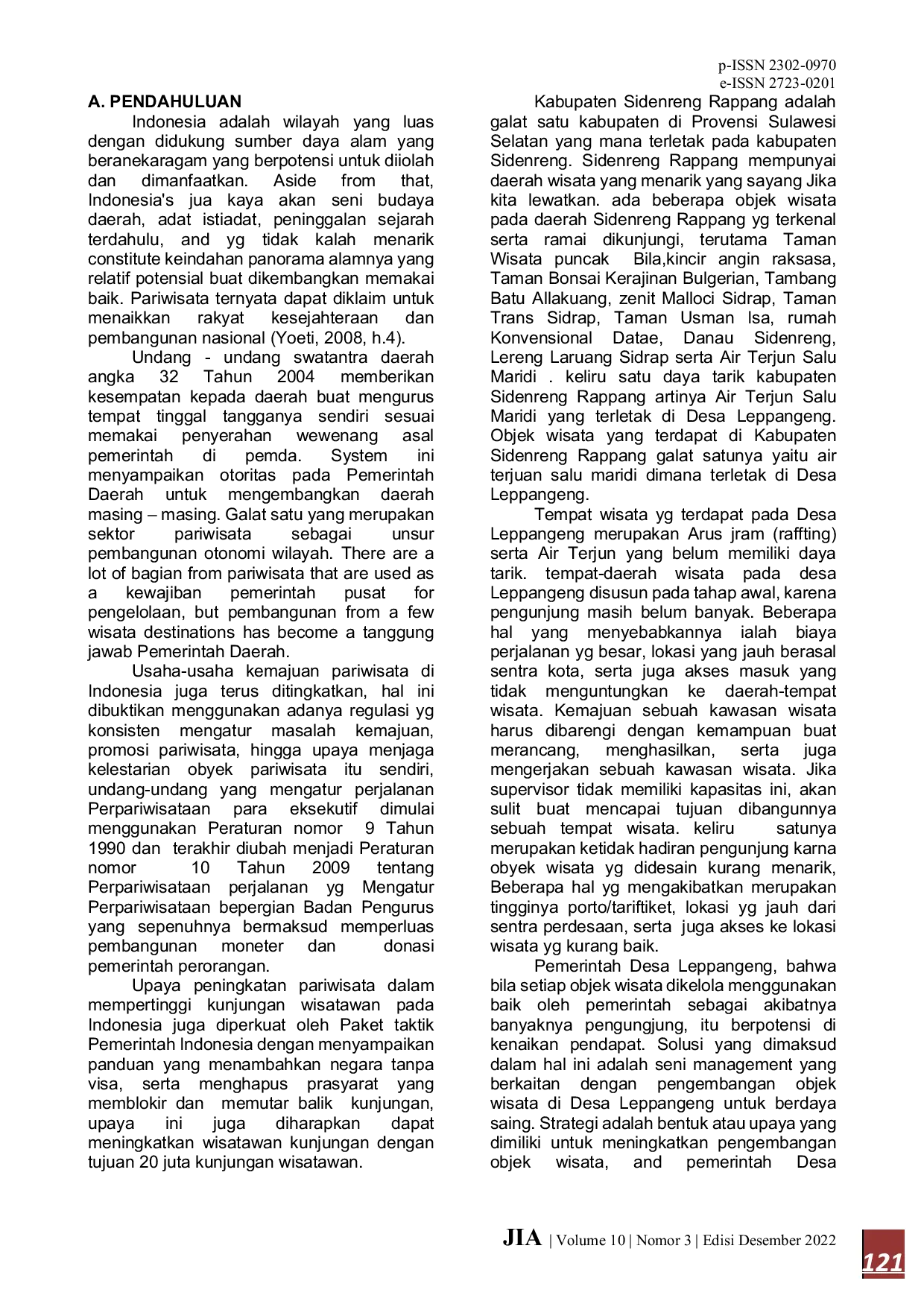 JIA: Jurnal Ilmiah AdministrasiJIA: Jurnal Ilmiah AdministrasiPenelitian ini bertujuan untuk menganalisis strategi Pengembangan Sektor Pariwisata Terhadap Masyarakat di Desa Leppangeng Kecamatan Pitu Riase Kabupaten Sidenreng Rappang. Penelitian ini menggunakan metode penelitian deskriptif dengan pendekatan kuantitatif. Variabel strategi pengembangan pariwisata berpengaruh positif dan signifikan terhadap kesejahteraan masyarakat, hal ini dapat dilihat dari signifikansi strategi pengembangan pariwisata sebesar 0,903, yang berarti lebih besar dari tingkat signifikansi yang digunakan yaitu 0,05. Selain itu, dapat dilihat dari thitung sebesar 0,123 yang berarti thitung lebih besar dari t tabel yaitu sebesar 0,022. Maka dengan demikian, Ha diterima, bahwa secara parsial Strategi Pengembangan Pariwisata berpengaruh positif dan signifikan terhadap kesejahteraan masyarakat sekitar objek wisata.