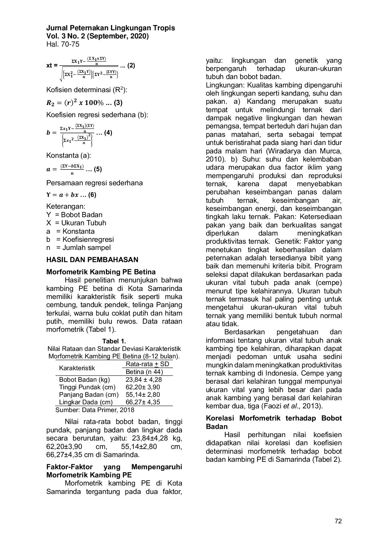 Jurnal Peternakan Lingkungan TropisJurnal Peternakan Lingkungan TropisKambing Peranakan Ettawa (PE) termasuk keragaman hayati Indonesia penghasil daging dan susu. Penelitian bertujuan mengetahui kesesuaian bobot badan (BB) dari hubungan morfometrik Tinggi Bahu (TB), Panjang Badan (PB) dan Lingkar Dada (LD) kambing PE di Kota Samarinda menurut SNI, dan rata-rata umur kawin pertama. Penentuan responden menggunakan teknik purposive sampling, berdasarkan kriteria peternak memiliki populasi kambing PE, umur antara 8-12 bulan. Sampel sasaran 44 ekor kambing betina, parameter yang diukur meliputi bobot badan, tinggi pundak, panjang badan, lingkar dada, dan umur kawin pertama. Analisis data menggunakan regresi linier sederhana, untuk mengetahui koefisien korelasi dan koefisien determinasi. Perfoma reproduksi kambing perah PE berada pada umur kawin pertama 10,23±0,60 bulan (333 hari), bobot badan dan morfometrik 8-12 bulan, memiliki keeratan tinggi di bandingkan morfometrik antara bobot badan dan panjang badan berdasarkan koefisien korelasi R= 0,618, serta koefisien determinasi R2= 0,382. Analisis menunjukkan persentase kambing PE betina 81,82% sesuai SNI 7352.1: 2015, sebesar 81,82%.
