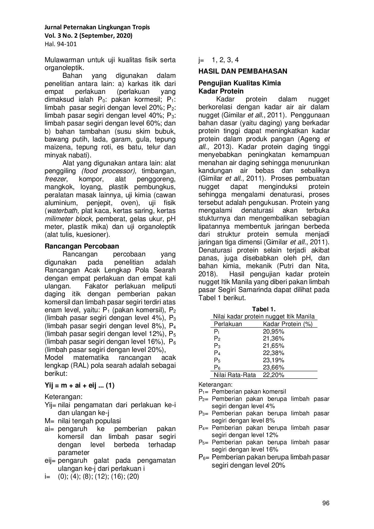 Jurnal Peternakan Lingkungan TropisJurnal Peternakan Lingkungan TropisPenelitian ini bertujuan untuk mengetahui komposisi kimia, kualitas fisik, organoleptik, dan daya terima terhadap nugget daging itik yang diberi pakan limbah Pasar Segiri. Penelitian dilaksanakan di Laboratorium Biokimia Fakultas Matematika Ilmu Pengetahuan Alam Universitas Mulawarman untuk uji komposisi kimia dan Laboratorium Produksi dan Teknologi Peternakan, Fakultas Pertanian Universitas Mulawarman untuk uji kualitas fisik serta organoleptik. Penelitian menggunakan Rancangan Acak Lengkap Pola Searah dengan faktor perlakuan adalah daging itik yang diberi pakan komersil dan limbah dari Pasar Segiri. Perlakuan terdiri atas enam level yaitu: P1 (pakan komersil), P2(limbah pasar segiri dengan level 4%), P3 (limbah pasar segiri dengan level 8%), P4 (limbah pasar segiri dengan level 12%), P5 (limbah pasar segiri dengan level 16%), P6 (limbah pasar segiri dengan level 20%). Hasil penelitian menunjukkan bahwa uji mutu hedonik (tekstur, rasa, dan kadar air) tidak memiliki pengaruh nyata, sementara pada uji kualitas fisik, nilai pH tidak berpengaruh nyata namun pada susut masak dan daya ikat air memiliki pengaruh nyata. Uji organoleptik menunjukkan hasil tidak berpengaruh nyata terhadap warna, rasa, dan tekstur, namun berpengaruh nyata terhadap aroma. Penelitian menunjukkan bahwa pemanfaatan limbah pasar sebagai pakan tidak berpengaruh terhadap kualitas nugget daging itik manila.