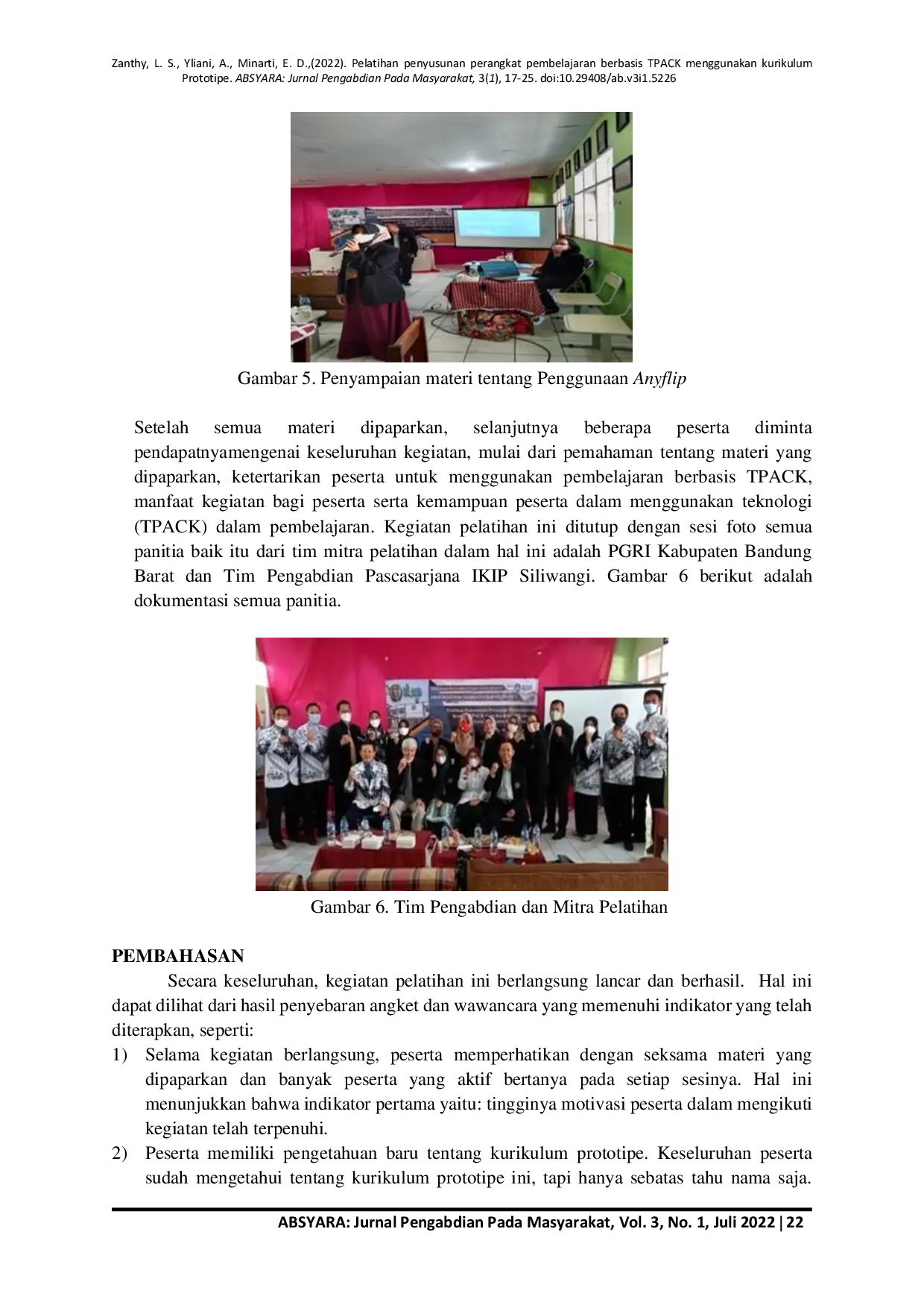 ABSYARA: Jurnal Pengabdian Pada MasayarakatABSYARA: Jurnal Pengabdian Pada MasayarakatPengabdian pada masyarakat ini bertujuan untuk memperkenalkan kurikulum prototipe dan meningkatkan kemampuan guru matematika di Kabupaten Bandung Barat dalam menyusun perangkat pembelajaran berbasis TPACK. Kegiatan pelatihan ini berbentuk pelatihan kompleksitas sederhana, yaitu mengikuti contoh yang sudah disediakan yang terdiri dari dua sesi: 1) Pengenalan kurikulum prototipe, dan 2) Pelatihan penyusunan perangkat pembelajaran berbasis TPACK, yang terdiri dari: a) Pelatihan penyusunan perangkat pembelajaran menggunakan aplikasi Liveworksheet dan b) Pelatihan penyusunan perangkat pembelajaran menggunakan aplikasi Anyflip. Produk yang dihasilkan berupa perangkat pembelajaran berbasis TPACK pada mata pelajaran matematika di Sekolah Dasar. Dari hasil observasi dan interview dengan peserta diketahui bahwa dari 70 persen peserta sudah mampu menyusun perangkat pembelajaran TPACK secara sederhana, selain itu keempat indikator yaitu: 1) tingginya motivasi peserta dalam mengikuti kegiatan; 2) dimilikinya pengetahuan baru tentang kurikulum prototype; 3) dimilikinya pengetahuan dan keterampilan baru tentang pembelajaran berbasis TPACK, dan 4) banyaknya jumlah peserta yang mampu menyusun pembelajaran telah terpenuhi, maka dapat disimpulkan bahwa kegiatan pengabdian pada masyarakat ini sudah mampu meningkatkan kemampuan dan keterampilan guru matematika se-Kabupaten Bandung Barat dalam menyusun perangkat pembelajaran berbasis TPACK menggunakan kurikulum prototipe.