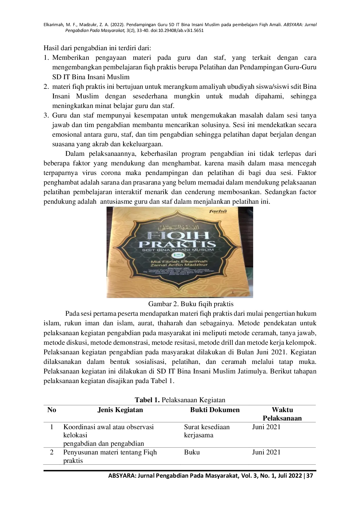ABSYARA: Jurnal Pengabdian Pada MasayarakatABSYARA: Jurnal Pengabdian Pada MasayarakatLemahnya proses pembelajaran merupakan salah satu problem dalam dunia pendidikan di Indonesia saat ini. Dalam proses pembelajaran, anak kurang didorong untuk mengembangkan kemampuan berpikir, mereka cenderung diarahkan untuk menghafal informasi sehingga murid lebih kepada pintar secara teoritis tetapi lemah dalam aplikasi. Ditambah dengan pembelajaran jarak jauh juga memberikan hasil yang tidak memuaskan bagi siswa karena hanya menerima materi tanpa tidak dipraktekkan. Melihat realitas inilah perlunya perubahan dalam proses pembelajaran. Tujuan kegiatan pengabdian pada masyarakat ini adalah untuk memberikan pendampingan tentang pembelajaran Fiqih praktis pada guru-guru SD IT Bina Insani Muslim. Walaupun kajian materi pada Fiqih praktis tidak terlalu dalam, diharapkan guru mampu memberikan pengajaran yang maksimal sebab Islam memberikan perhatian yang lebih terhadap ibadah sehari-hari. Untuk mencapai tujuan tersebut, maka dilakukan kegiatan meliputi pelatihan dan (Fiqh Praktis). Kegiatan pengabdian ini dilaksanakan di SD IT Bina Insani Muslim yang berada di Jatimulya Tambun Selatan. Mitra pengabdian adalah seluruh guru di SD IT Bina Islam Muslim. Pengabdian ini dilaksanakan pada tanggal 14 dan 15 Juni 2021. Bertempat di aula SDIT Bina Islam Muslim dihadiri 23 guru yang dibagi 2 sesi Mengingat pandemi COVID ini belum kunjung usai maka acara pelatihan dan pendampingan ini dibagi dua hari. Metode yang digunakan dalam pelaksanaan ini adalah ceramah dan demonstrasi atau pelatihan secara langsung. Hasil dari kegiatan pengabdian masyarakat adalah meningkatkan kemampuan dan pemahaman para pendidik dalam hal materi tentang fiqh praktis dan meningkatkan dan mengembangkan pemahaman peserta pendidik dalam hal masalah fiqh di kehidupan sehari-hari.
