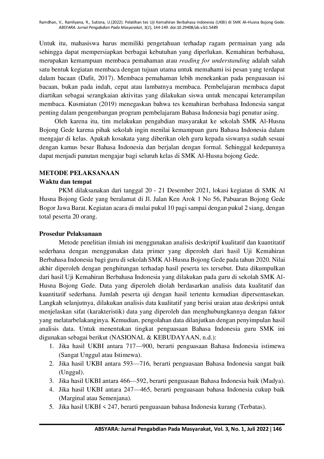 ABSYARA: Jurnal Pengabdian Pada MasayarakatABSYARA: Jurnal Pengabdian Pada MasayarakatKemampuan berbahasa dibutuhkan setiap saat dalam setiap segmen kehidupan bermasyarakat. Tingkat kemampuan berbahasa Indonesia yang baik dan benar berbeda pada setiap individu. Dalam menguji tingkat kemampuan seseorang dalam berbahasa Indonesia baik lisan maupun tulisan dapat dilakukan dengan menjalani “Uji Kompetensi Bahasa Indonesia. Dengan ini seseorang dapat mengetahui tingkat kemampuan berbahasa Indonesia dan dapat menyesuaikan dengan kebutuhan bahasa yang diharapkan. Uji Kemahiran Berbahasa Indonesia adalah sarana untuk mengukur kemahiran seseorang dalam berbahasa Indonesia lisan dan tulis. UKBI terdiri atas lima seksi, yaitu Seksi I (Mendengarkan), Seksi II (Merespons Kaidah), dan Seksi III (Membaca) dalam bentuk pilihan ganda, serta Seksi IV (Menulis) dalam bentuk presentasi tulis dan Seksi V (Berbicara) dalam bentuk presentasi lisan. Di masa pandemi Covid 19 saat ini, pelaksanaan UKBI tidak bisa digelar secara luring dan massal dalam satu tempat. UKBI Adaptif merupakan tes untuk mengukur kemahiran berbahasa penutur bahasa Indonesia yang merupakan hal yang baru bagi peserta didik di SMK AL-Husna Bojong Gede sehingga perlu untuk disosialisasikan dan diujikan. Tujuan penelitian ini adalah untuk mengetahui penguasaan bahasa Indonesia terhadapa gur-guru di SMK Al-Husna Bojong Gede. Metode deskriptif dan kuantitatif digunakan dalam penelitian. Hasil penelitian menunjukan bahwa sebagian besar peserta memperoleh nilai antara 300—400 yang berarti kemampuan mereka berada di kategori cukup baik. Dengan demikian, dapat dikatakan bahwa UKBI merupakan alat uji yang dapat digunakan untuk mengukur penguasaan bahasa Indonesia serta penggunaan bahasa Indonesia yang baik dan benar oleh guru.