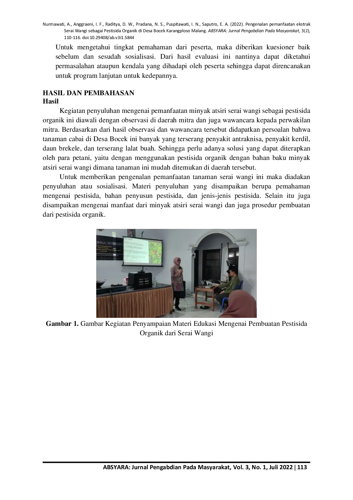 ABSYARA: Jurnal Pengabdian Pada MasayarakatABSYARA: Jurnal Pengabdian Pada MasayarakatDesa Bocek yang berlokasi di Kecamatan Karangploso, Kabupaten Malang merupakan salah satu desa yang dikenal dengan produksi cabainya. Tetapi, produksi tanaman cabai di desa ini sering terjangkit penyakit yang diakibatkan oleh hama seperti jamur Colletotrichum spp yang akan mengakibatkan penyakit antraksnosa (patek). Penyakit ini dapat menyebabkan cacat pada cabai sehingga menurunkan kualitas produksi cabai. Penanganan yang telah dilakukan oleh para petani adalah dengan menggunakan pestisida kimia namun dinilai kurang efektif dan juga memiliki efek negatif bagi lingkungan. Salah satu solusi yang dapat digunakan adalah menggunakan ekstrak dari tanaman serai untuk digunakan menjadi pestisida organik. Tujuan dari kegiatan pengabdian kepada masyarakat ini untuk mengenalkan pestisida organik dengan bahan baku ekstrak tanaman serai kepada Kelompok Tani Tri Rejeki di Desa Bocek. Kegiatan sosialisasi dilaksanakan dengan menggunakan metode ceramah dengan materi meliputi pengenalan pestisida, perbedaan pestisida kimia dan organik, ekstraksi minyak atsiri dengan metode sederhana, dan proses produksi pestisida organik dengan ekstrak serai wangi. Juga dilakukan evaluasi terhadap peserta melalui kuesioner yang diberikan sebelum dan sesudah sosialisasi. Setelah dilakukan penyuluhan, peserta lebih memahami mengenai pestisida organik dan cara produksinya.