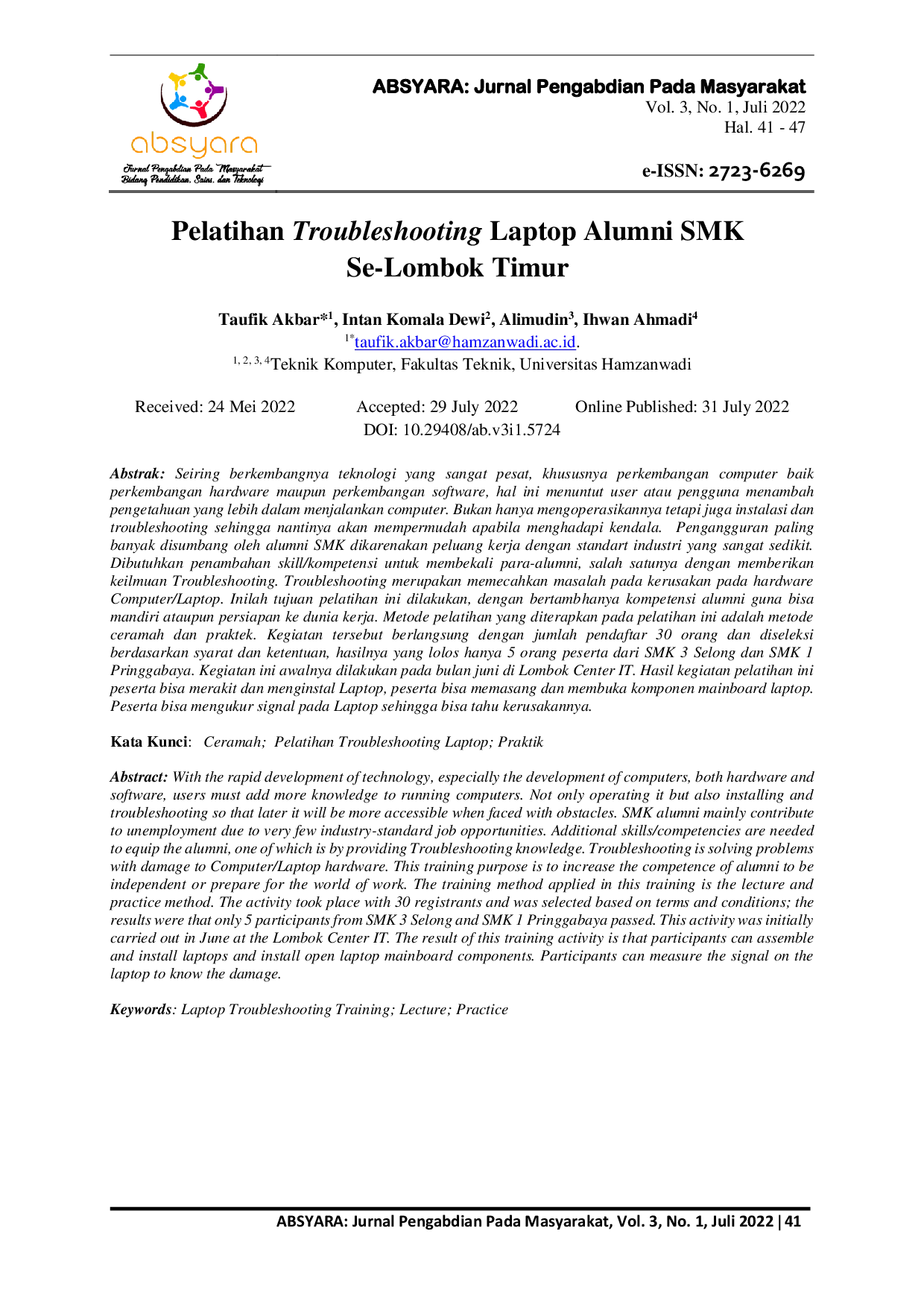 ABSYARA: Jurnal Pengabdian Pada MasayarakatABSYARA: Jurnal Pengabdian Pada MasayarakatSeiring berkembangnya teknologi, khususnya komputer, pengguna perlu menambah pengetahuan dalam menjalankan komputer, tidak hanya mengoperasikannya tetapi juga instalasi dan troubleshooting. Pengangguran banyak disumbang oleh alumni SMK karena sedikitnya peluang kerja standar industri. Dibutuhkan penambahan skill/kompetensi, salah satunya dengan memberikan keilmuan Troubleshooting, yaitu memecahkan masalah kerusakan hardware komputer/laptop. Pelatihan ini bertujuan untuk meningkatkan kompetensi alumni agar mandiri atau siap kerja. Metode pelatihan adalah ceramah dan praktek. Kegiatan ini diikuti oleh 5 peserta dari SMK 3 Selong dan SMK 1 Pringgabaya. Hasilnya, peserta mampu merakit dan menginstal laptop, memasang komponen mainboard, dan mengukur signal laptop untuk mengetahui kerusakan.