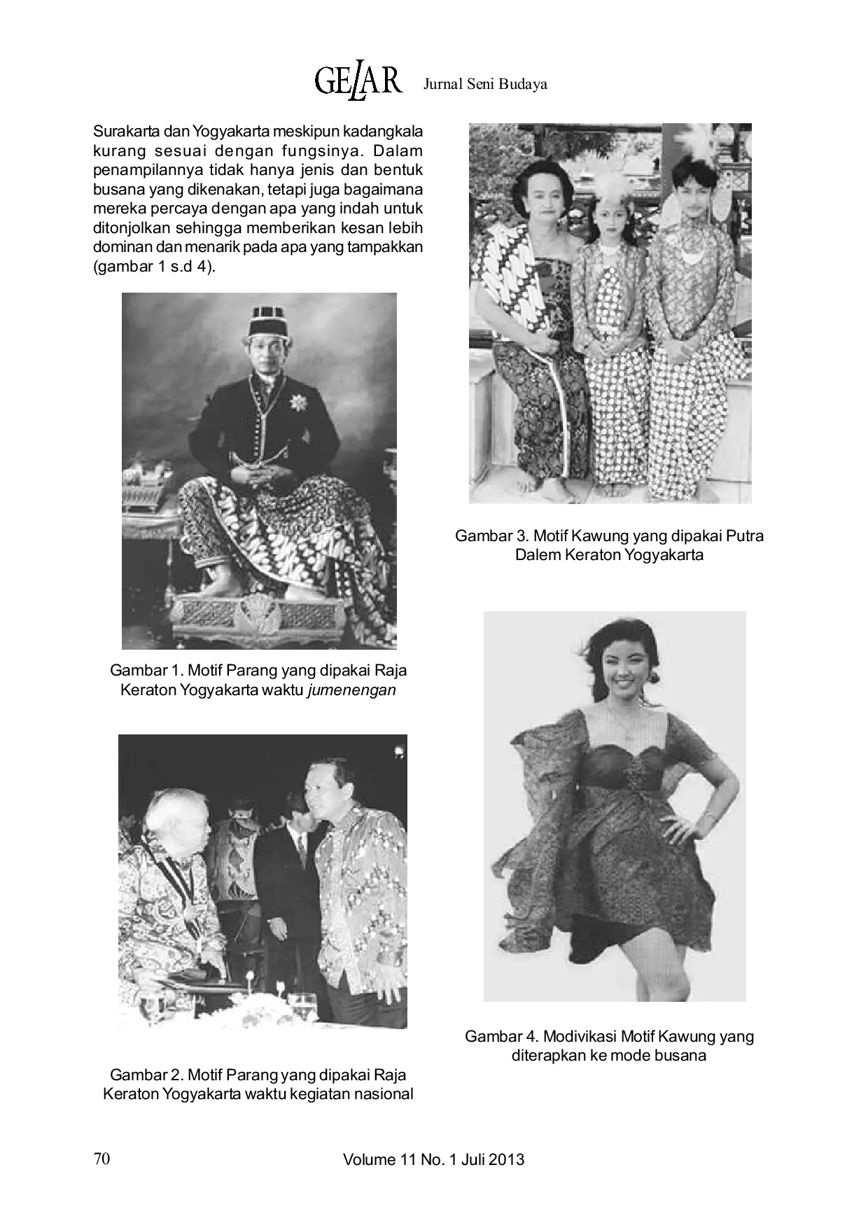 Gelar: Jurnal Seni BudayaGelar: Jurnal Seni BudayaBatik Surakarta dan Yogyakarta memiliki ciri khas masing‑masing; Surakarta dikenal dengan latar berwarna kuning‑coklat, sedangkan Yogyakarta berlatarkan putih bersih. Pada masa lampau, motif batik tidak hanya diproduksi untuk keindahan visual, melainkan juga mengandung makna filosofis yang selaras dengan nilai‑nilai kehidupan. Perubahan desain batik kini dipengaruhi oleh faktor estetika, teknologi, ekonomi, sosial, budaya, dan politik, sehingga terjadi pergeseran fungsi dan penampilan motif dari konteks sakral ke pasar konsumen modern.