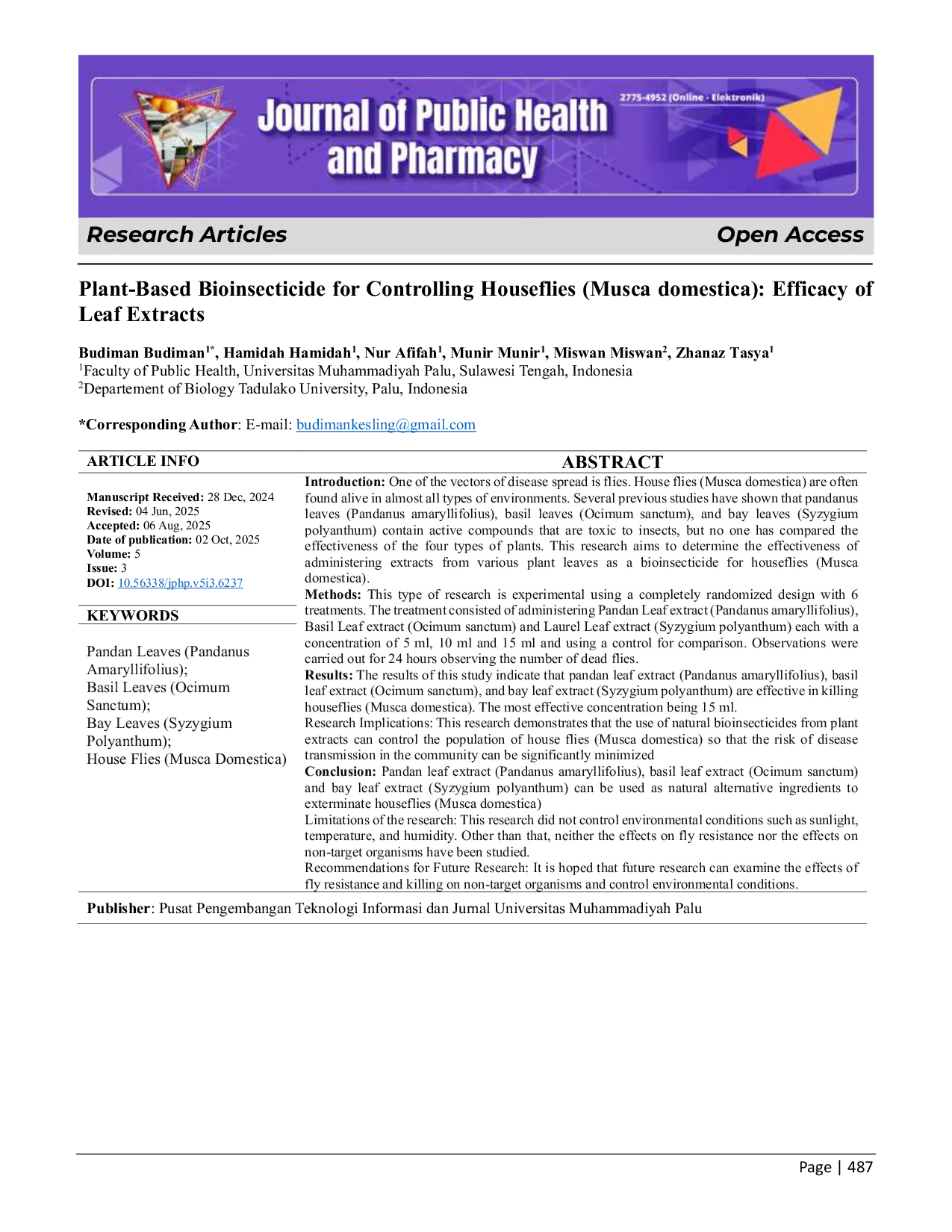 Journal of Public Health and PharmacyJournal of Public Health and PharmacyOne of the vectors of disease spread is flies. House flies (Musca domestica) are often found in almost all types of environments. Several previous studies have shown that pandanus leaves (Pandanus amaryllifolius), basil leaves (Ocimum sanctum), and bay leaves (Syzygium polyanthum) contain active compounds that are toxic to insects, but no one has compared the effectiveness of the four types of plants. This research aims to determine the effectiveness of administering extracts from various plant leaves as a bioinsecticide for houseflies (Musca domestica).