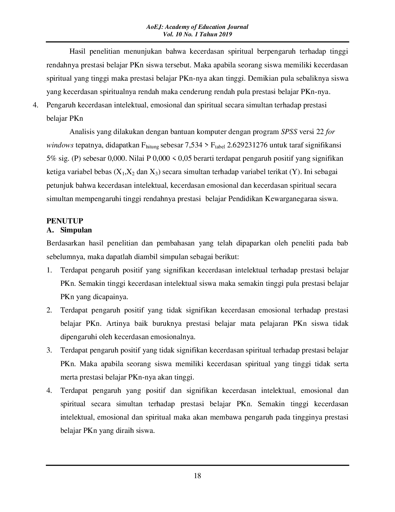 Terdapat pengaruh positif dan signifikan kecerdasan intelektual terhadap prestasi belajar Pendidikan Kewarganegaraan.Terdapat pengaruh positif tapi tidak signifikan kecerdasan emosional dan kecerdasan spiritual terhadap prestasi belajar Pendidikan Kewarganegaraan.Secara simultan, kecerdasan intelektual, emosional, dan spiritual memiliki pengaruh positif dan signifikan terhadap prestasi belajar Pendidikan Kewarganegaraan.