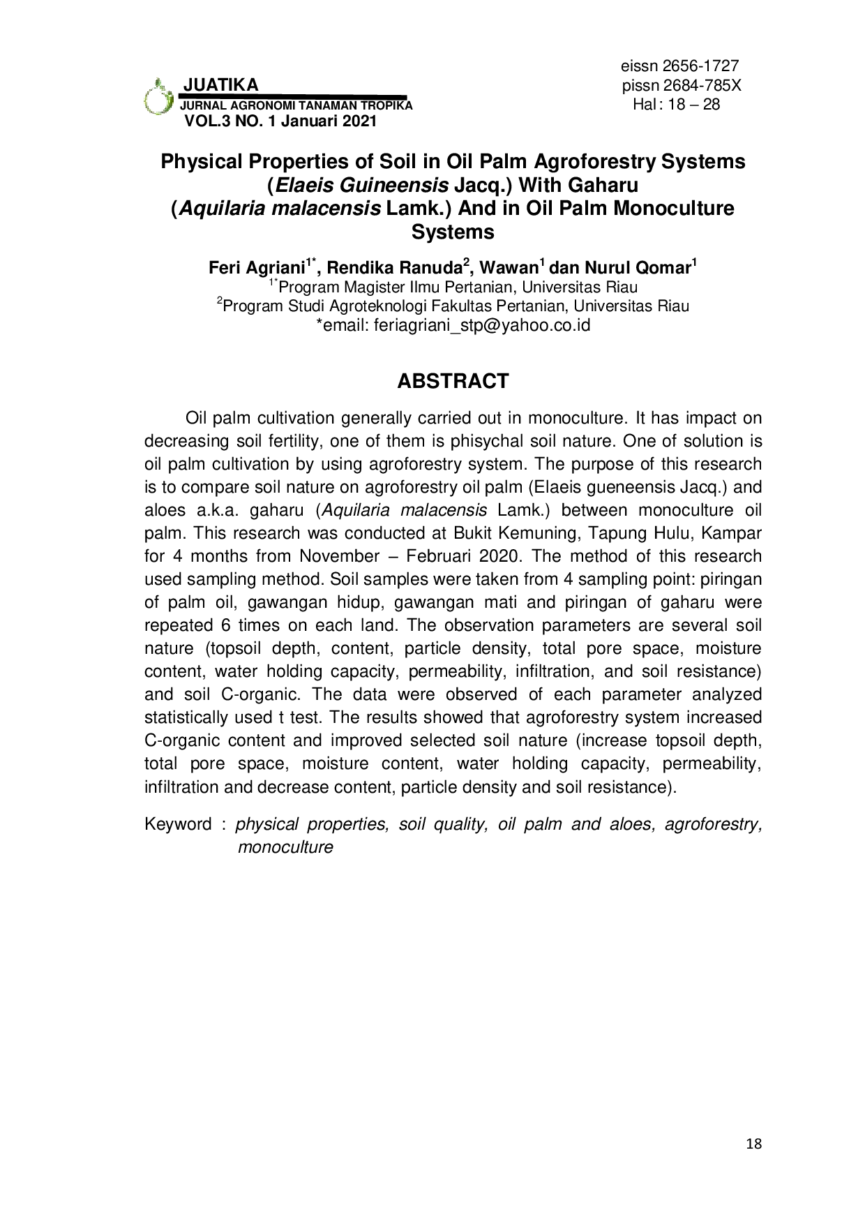 JURNAL AGRONOMI TANAMAN TROPIKA (JUATIKA)JURNAL AGRONOMI TANAMAN TROPIKA (JUATIKA)Oil palm cultivation is generally carried out in monoculture, which can lead to decreased soil fertility, including its physical properties. One potential solution is to implement oil palm cultivation using an agroforestry system. This research aimed to compare soil properties in agroforestry systems combining oil palm (Elaeis guineensis Jacq.) and agarwood (Aquilaria malacensis Lamk.) with those in monoculture oil palm systems. The study was conducted at Bukit Kemuning, Tapung Hulu, Kampar for four months (November – February 2020), employing a sampling method. Soil samples were collected from four locations – oil palm circles, living interrows, dead interrows, and agarwood circles – with six replicates each. Parameters observed included topsoil depth, content, particle density, total pore space, moisture content, water holding capacity, permeability, infiltration, soil resistance, and soil C-organic. Data analysis was performed using a t-test. The results indicated that the agroforestry system increased C-organic content and improved selected soil properties, such as increased topsoil depth, total pore space, moisture content, water holding capacity, permeability, and infiltration, while decreasing content, particle density, and soil resistance.