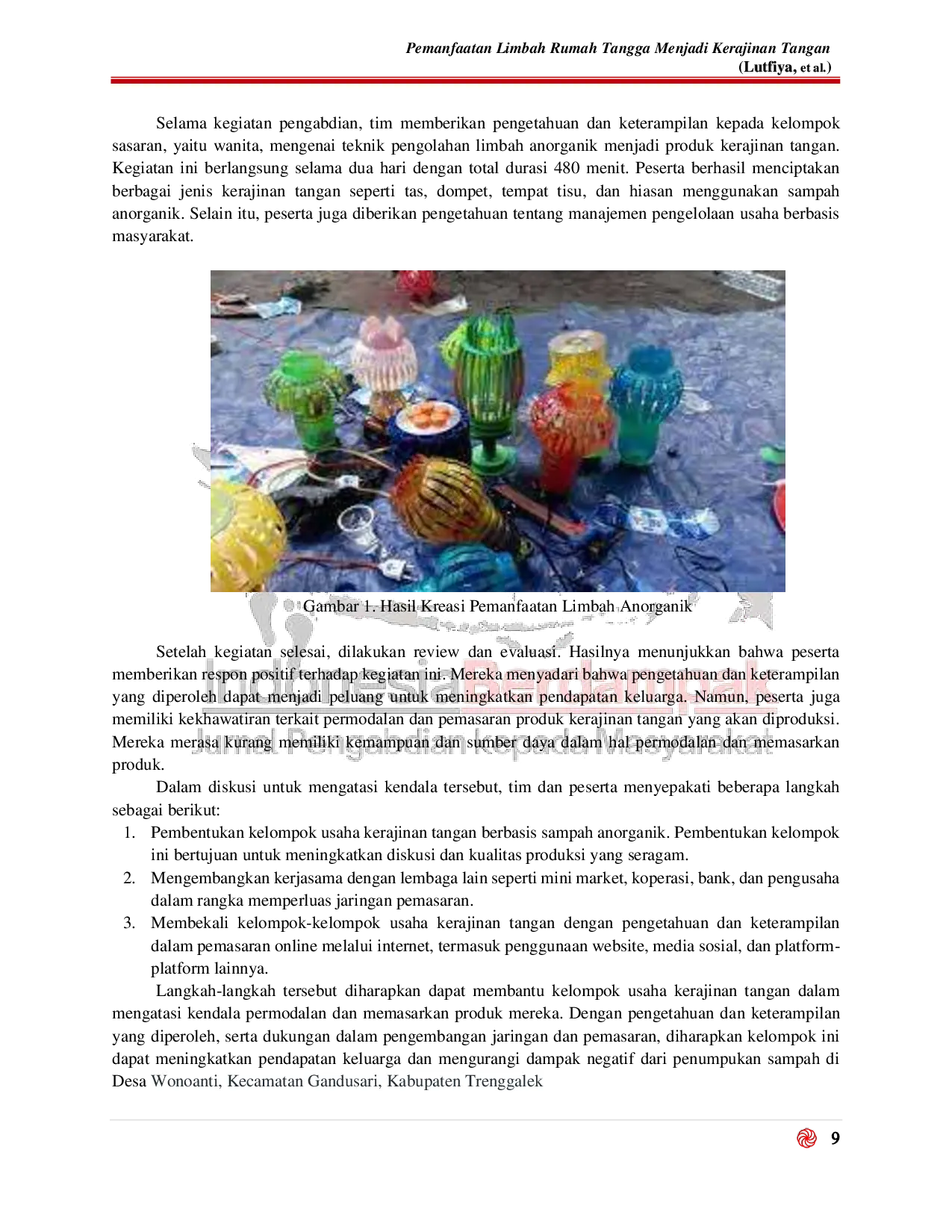 Untuk penelitian lanjutan, dapat dipertimbangkan beberapa arah studi. Pertama, bagaimana mengembangkan model bisnis yang berkelanjutan bagi kelompok usaha kerajinan tangan berbasis sampah anorganik, dengan fokus pada strategi pemasaran dan permodalan. Kedua, studi komparatif tentang dampak pemberdayaan perempuan dalam pengelolaan sampah dan kreativitas di berbagai desa atau komunitas, untuk mengidentifikasi faktor-faktor kunci keberhasilan. Ketiga, penelitian tentang inovasi teknologi dalam pengolahan sampah anorganik menjadi kerajinan tangan, dengan tujuan meningkatkan efisiensi dan kualitas produk.