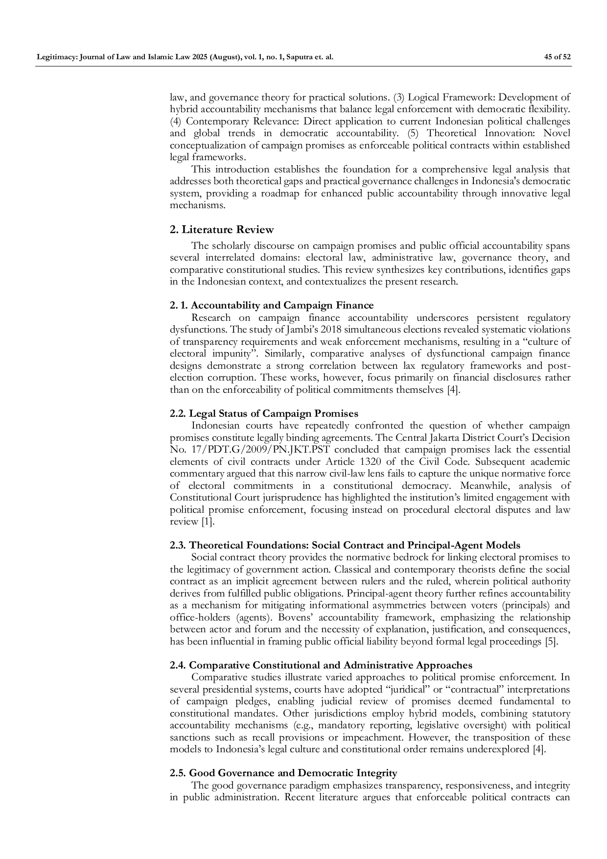 Legtimacy: Journal Of Law and Islamic LawLegtimacy: Journal Of Law and Islamic LawAbstrak: Artikel ini merekonseptualisasi janji kampanye sebagai kontrak politik yang mengikat dan meninjau tanggung jawab pejabat publik dalam struktur pemerintahan. Dengan metode normatif-juridik, penelitian ini meninjau peraturan konstitusi, undang-undang administratif, dan putusan pengadilan penting, seperti Putusan Pengadilan Negeri Jakarta Pusat No. 17/PDT.G/2009/PN.JKT.PST, untuk mengidentifikasi celah penerapan. Studi ini mengintegrasikan teori kontrak sosial, kerangka akuntabilitas principal-agent, dan model akuntabilitas Bovens untuk mengembangkan mekanisme hibrida yang menggabungkan amandemen legislatif, pengawasan parlemen yang ditingkatkan, tinjauan yudisial yang lebih luas, dan pemantauan masyarakat sipil. Temuan utama menunjukkan kegagalan sistemik dalam memenuhi komitmen pemilu, terbukti melalui kasus-kasus berdampak besar dalam prioritas infrastruktur, janji pekerjaan, manajemen fiskal, inisiatif anti-korupsi, dan penegakan hak kekayaan intelektual. Analisis kuantitatif Skor Dampak Akuntabilitas Hukum memastikan bahwa pelanggaran janji penciptaan pekerjaan dan kontradiksi kebijakan pajak mewakili defisit akuntabilitas terparah. Penelitian ini menunjukkan bahwa fondasi hukum konstitusional dan administratif Indonesia dapat mendukung mekanisme kontrak politik yang dapat ditegakkan, tetapi memerlukan reformasi institusional untuk menerapkannya secara efektif. Dengan menyelaraskan komitmen pemilu dengan kewajiban hukum, kerangka kerja yang diusulkan memperkuat pemerintahan demokratis dan rule of law.