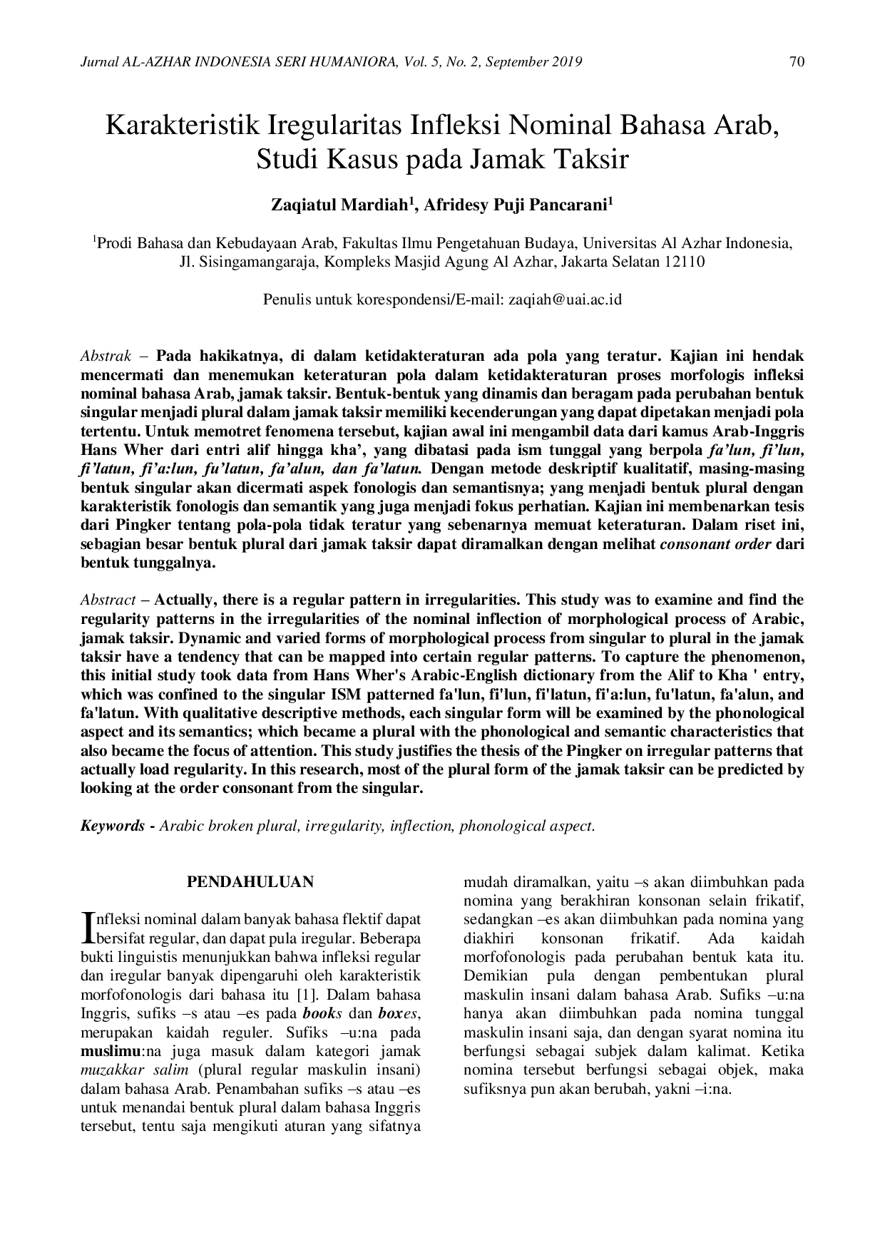 JURNAL Al-AZHAR INDONESIA SERI HUMANIORAJURNAL Al-AZHAR INDONESIA SERI HUMANIORAPada hakikatnya, di dalam ketidakteraturan ada pola yang teratur. Kajian ini hendak mencermati dan menemukan keteraturan pola dalam ketidakteraturan proses morfologis infleksi nominal bahasa Arab, jamak taksir. Bentuk-bentuk yang dinamis dan beragam pada perubahan bentuk singular menjadi plural dalam jamak taksir memiliki kecenderungan yang dapat dipetakan menjadi pola tertentu. Untuk memotret fenomena tersebut, kajian awal ini mengambil data dari kamus Arab-Inggris Hans Wher dari entri alif hingga kha, yang dibatasi pada ism tunggal yang berpola falun, filun, filatun, fia:lun, fulatun, faalun, dan falatun. Dengan metode deskriptif kualitatif, masing-masing bentuk singular akan dicermati aspek fonologis dan semantisnya; yang menjadi bentuk plural dengan karakteristik fonologis dan semantik yang juga menjadi fokus perhatian. Kajian ini membenarkan tesis dari Pingker tentang pola-pola tidak teratur yang sebenarnya memuat keteraturan. Dalam riset ini, sebagian besar bentuk plural dari jamak taksir dapat diramalkan dengan melihat consonant order dari bentuk tunggalnya.