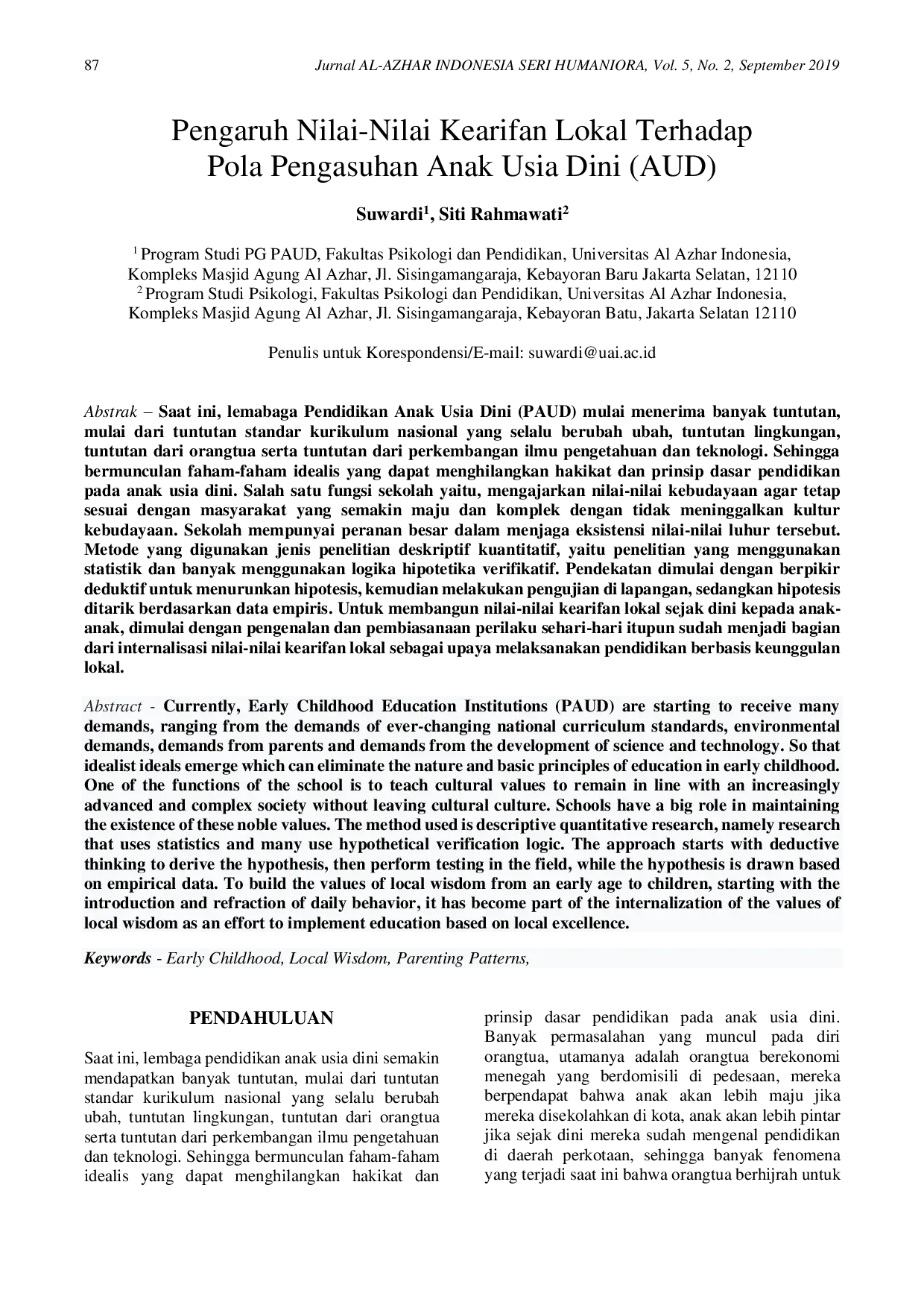 JURNAL Al-AZHAR INDONESIA SERI HUMANIORAJURNAL Al-AZHAR INDONESIA SERI HUMANIORASaat ini, lembaga Pendidikan Anak Usia Dini (PAUD) mulai menerima banyak tuntutan, mulai dari tuntutan standar kurikulum nasional yang selalu berubah ubah, tuntutan lingkungan, tuntutan dari orangtua serta tuntutan dari perkembangan ilmu pengetahuan dan teknologi. Sehingga bermunculan faham-faham idealis yang dapat menghilangkan hakikat dan prinsip dasar pendidikan pada anak usia dini. Salah satu fungsi sekolah yaitu, mengajarkan nilai-nilai kebudayaan agar tetap sesuai dengan masyarakat yang semakin maju dan komplek dengan tidak meninggalkan kultur kebudayaan. Sekolah mempunyai peranan besar dalam menjaga eksistensi nilai-nilai luhur tersebut. Metode yang digunakan jenis penelitian deskriptif kuantitatif, yaitu penelitian yang menggunakan statistik dan banyak menggunakan logika hipotetika verifikatif. Pendekatan dimulai dengan berpikir deduktif untuk menurunkan hipotesis, kemudian melakukan pengujian di lapangan, sedangkan hipotesis ditarik berdasarkan data empiris. Untuk membangun nilai-nilai kearifan lokal sejak dini kepada anak-anak, dimulai dengan pengenalan dan pembiasanaan perilaku sehari-hari itupun sudah menjadi bagian dari internalisasi nilai-nilai kearifan lokal sebagai upaya melaksanakan pendidikan berbasis keunggulan lokal.