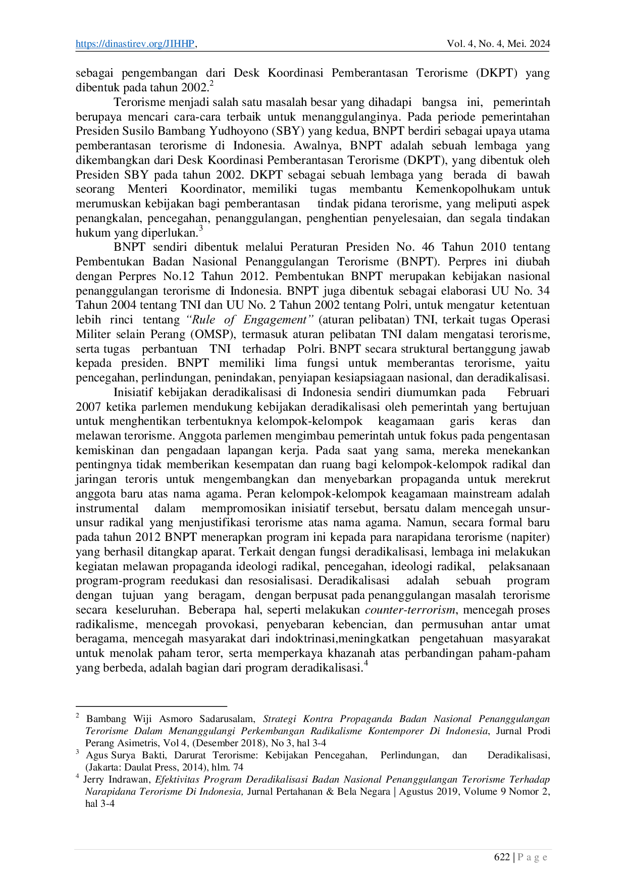 Jurnal Ilmu Hukum, Humaniora dan PolitikJurnal Ilmu Hukum, Humaniora dan PolitikTujuan dari penelitian ini untuk mengetahui efektivitas program deradikalisasi terhadap perpecahan di Lapas Resiko Tinggi kelas II A Karanganyar dan hambatan-hambatan yang dihadapi Lapas Resiko Tinggi kelas II A Karanganyar dalam menjalankan program deradikalisasi. Metode penelitian yang digunakan yaitu yuridis sosiologis, suatu pendekatan berdasarkan norma-norma atau peraturan yang mengikat, sehingga diharapkan pendekatan ini dapat diketahui bagaimana hukum masyarakat secara empiris merupakan gejala yang dapat dipelajari sebagai suatu variabel penyebab yang menimbulkan akibat-akibat pada berbagai segi kehidupan sosial. Program deradikalisasi terhadap antioksidan di Lapas High Risk kelas II A belum efektif di laksanakan hal ini karena, belum berhasil mengubah sikap ideologi dari radikal menjadi tidak radikal dengan indikator pembantu teroris tersebut membuat pernyataan ikrar setia kepada NKRI. Hambatan yang dihadapi Lapas High Risk kelas II A Karanganyar dalam menjalankan program deradikalisasi yaitu pertama, faktor masyarakat/budaya hukum, sifat tidak kooperatifnya pembantu membuat upaya pelatihan yang merupakan bagian dari Upaya deradikalisasai bagi narapidana terorisme sukar untuk mencapai hasil yang baik, kedua, Faktor penegakan hukum/struktur, Sumber Daya Manusia (SDM) rata-rata tidak sesuai dengan kompetensi pelaksana yang diperlukan dalam pembinaan Napiter selain itu jumlah Pembina Napiter sangat sedikit dengan skala satu Pembina bertugas membina sepuluh Napiter.