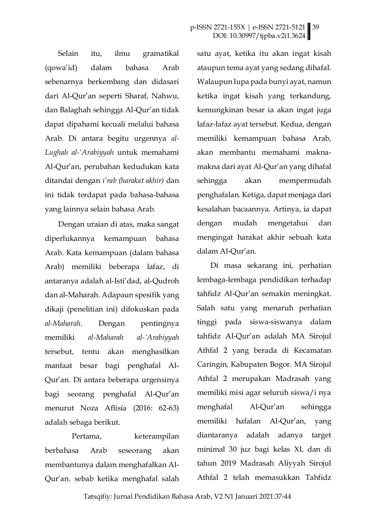Tatsqifiy: Jurnal Pendidikan Bahasa ArabTatsqifiy: Jurnal Pendidikan Bahasa ArabAbstrak: Al-Quran diturunkan dengan bahasa Arab, dengan bahasa inilah kita dapat membaca Al-Quran dan mempelajarinya. Berbicara mengenai bahasa Arab, terlepas dari empat keterampilan: keterampilan membaca, keterampilan menulis, keterampilan menyimak, dan keterampilan berbicara. Pada masa sekarang di Indonesia, bahasa Arab bukan hanya dianggap sebagai bahasa asing, tetapi sudah menjadi salah satu pelajaran yang pokok di lembaga-lembaga sekolah. Adapun tujuan penelitian ini bermaksud mengetahui hubungan kemampuan bahasa Arab dengan prestasi menghafal Al-Quran. Kemampuan dalam bahasa Arab memiliki beberapa kata yang memiliki kemiripan makna, di antaranya kata al-Istidad, al-Qudroh dan al-Maharah. Adapun kemampuan yang dimaksud dalam penelitian ini adalah lebih spesifik pada al-Maharah dengan objek atau populasi yang diteliti bertempat di Madrasah Aliyyah Sirojul Athfal 2 pada seluruh kelas sebelas. Objek penelitian ini meliputi semua siswa kelas sebelas yang berjumlah 44 siswa sebagai fokus pemusatannya, sedangkan data diperoleh melalui metode wawancara dan metode dokumentasi yang berupa jenis penelitiannya menggunakan analisis korelasi antara variabel X & variabel Y untuk diketahuinya hubungan diantara keduanya. Dan Hasil penelitian berdasarkan analisis data menghasilkan nilai hubungan sebesar 0,728 yang menunjukkan hubungan dalam interval yang kuat, maka hipotesis dapat diterima.