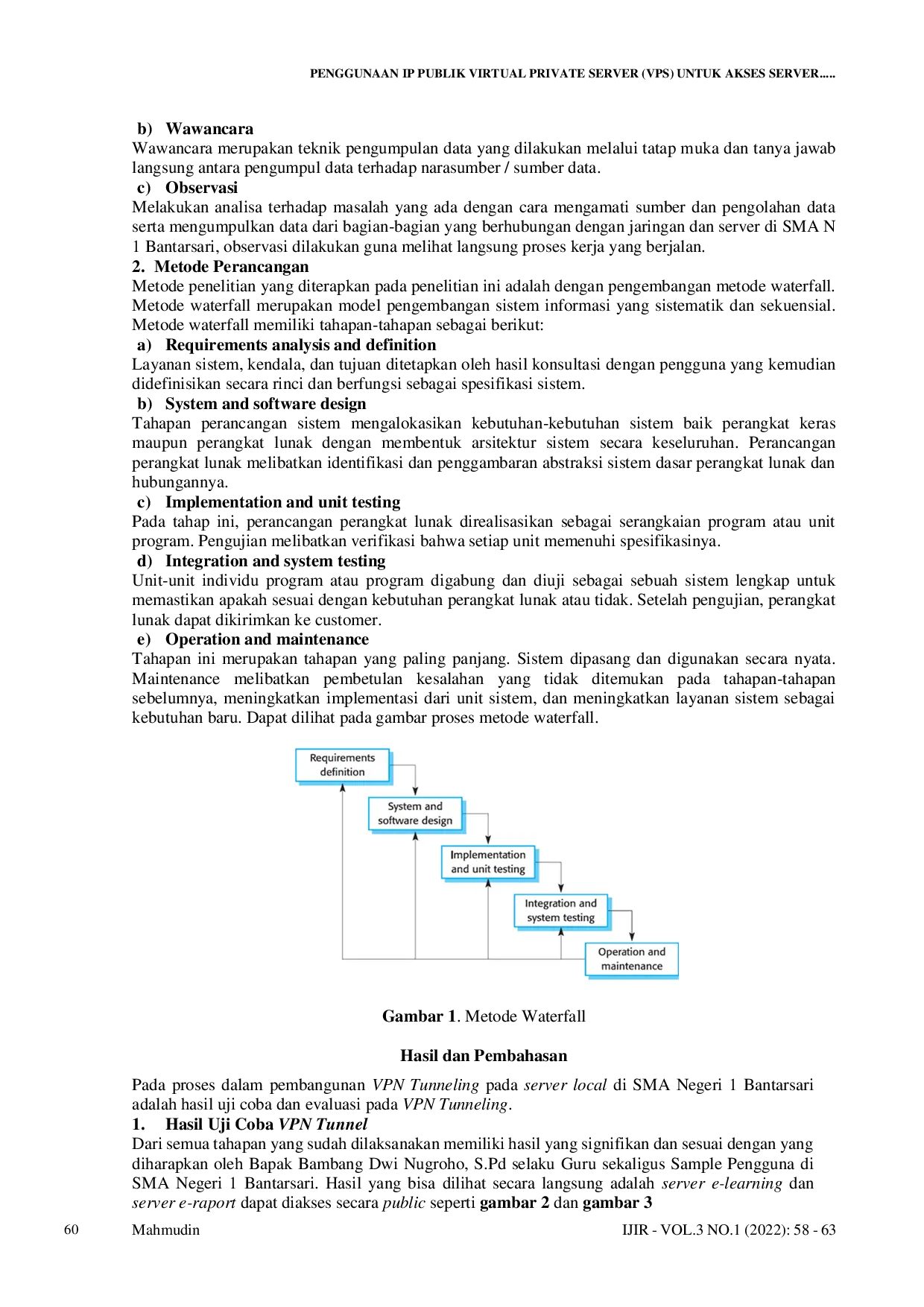 Indonesian Journal of Informatics and ResearchIndonesian Journal of Informatics and ResearchJaringan komputer merupakan kumpulan beberapa komputer bahkan jutaan komputer, disebut dengan jaringan komputer bisa berupa jaringan lokal maupun interlokal, jaringan lokal atau disebut dengan LAN (Lokal Area Network) dan jaringan interlokal atau disebut dengan internet. Layanan internet merupakan fasilitas yang tidak bisa lepas dari kehidupan manusia sehingga diperlukan suatu cara untuk memanfaatkan internet dengan maksimal. Virtual Private Network (VPN) merupakan suatu cara untuk membuat sebuah jaringan bersifat “private dan aman dengan menggunakan jaringan publik misalnya internet. VPN dapat mengirim data antara dua komputer yang melewati jaringan publik sehingga seolah-olah terhubung secara point to point. Data dienkapsulasi (dibungkus) dengan header yang berisi informasi routing untuk mendapatkan koneksi point to point sehingga data dapat melewati jaringan publik dan dapat mencapai akhir tujuan. Virtual Private Network yang bisa menghubungkan antara jaringan publik dengan lokal, sehingga menjadi dasar dalam implementasi tunneling terhadap server SMA Negeri 1 Bantarsari. Permasalahan yang dihadapi di sekolah tersebut karena server yang sekolah miliki belum bisa diakses melalui jaringan public, karena alasan tersebut maka penulis melakukan implementasi vpn tunnel terhadap jaringan server sekolah. Menurut pandangan pengguna, koneksi VPN merupakan koneksi point to point antara user komputer dengan server korporasi dan data terkirim diatas jaringan “dedicated, padahal tidak demikian kenyataannya.