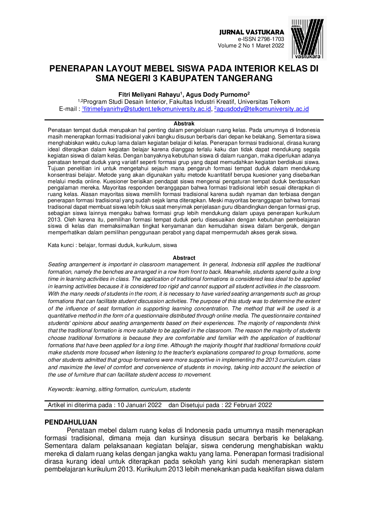 Jurnal Vastukara: Jurnal Desain Interior, Budaya, dan Lingkungan TerbangunJurnal Vastukara: Jurnal Desain Interior, Budaya, dan Lingkungan TerbangunPenataan tempat duduk merupakan hal penting dalam pengelolaan ruang kelas. Pada umumnya di Indonesia masih menerapkan formasi tradisional yakni bangku disusun berbaris dari depan ke belakang. Sementara siswa menghabiskan waktu cukup lama dalam kegiatan belajar di kelas. Penerapan formasi tradisional, dirasa kurang ideal diterapkan dalam kegiatan belajar karena dianggap terlalu kaku dan tidak dapat mendukung segala kegiatan siswa di dalam kelas. Dengan banyaknya kebutuhan siswa di dalam ruangan, maka diperlukan adanya penataan tempat duduk yang variatif seperti formasi grup yang dapat memudahkan kegiatan berdiskusi siswa. Tujuan penelitian ini untuk mengetahui sejauh mana pengaruh formasi tempat duduk dalam mendukung konsentrasi belajar. Metode yang akan digunakan yaitu metode kuantitatif berupa kuesioner yang disebarkan melalui media online. Kuesioner berisikan pendapat siswa mengenai pengaturan tempat duduk berdasarkan pengalaman mereka. Mayoritas responden beranggapan bahwa formasi tradisional lebih sesuai diterapkan di ruang kelas. Alasan mayoritas siswa memilih formasi tradisional karena sudah nyaman dan terbiasa dengan penerapan formasi tradisional yang sudah sejak lama diterapkan. Meski mayoritas beranggapan bahwa formasi tradisonal dapat membuat siswa lebih fokus saat menyimak penjelasan guru dibandingkan dengan formasi grup, sebagian siswa lainnya mengaku bahwa formasi grup lebih mendukung dalam upaya penerapan kurikulum 2013. Oleh karena itu, pemilihan formasi tempat duduk perlu disesuaikan dengan kebutuhan pembelajaran siswa di kelas dan memaksimalkan tingkat kenyamanan dan kemudahan siswa dalam bergerak, dengan memperhatikan dalam pemilihan penggunaan perabot yang dapat mempermudah akses gerak siswa.