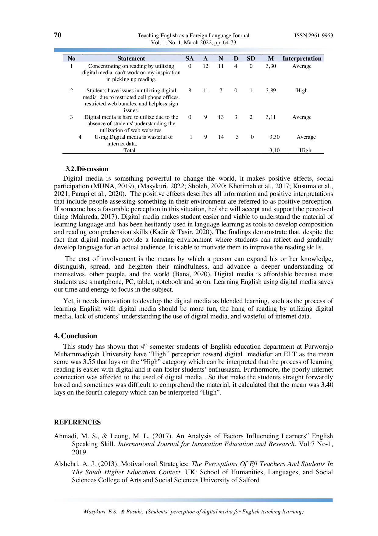 Penelitian ini menunjukkan bahwa mahasiswa semester empat di Universitas Muhammadiyah Purworejo memiliki persepsi tinggi terhadap media digital untuk ELT.Namun, terdapat beberapa kesulitan yang dihadapi dalam penggunaan media digital, seperti fasilitas ponsel yang terbatas, paket internet yang terbatas, dan masalah sinyal yang buruk.Oleh karena itu, perlu adanya upaya untuk mengatasi hambatan-hambatan tersebut agar pemanfaatan media digital dalam pembelajaran bahasa Inggris dapat berjalan secara optimal.Pengembangan infrastruktur dan peningkatan literasi digital menjadi kunci untuk memaksimalkan potensi media digital dalam meningkatkan kualitas pembelajaran bahasa Inggris.