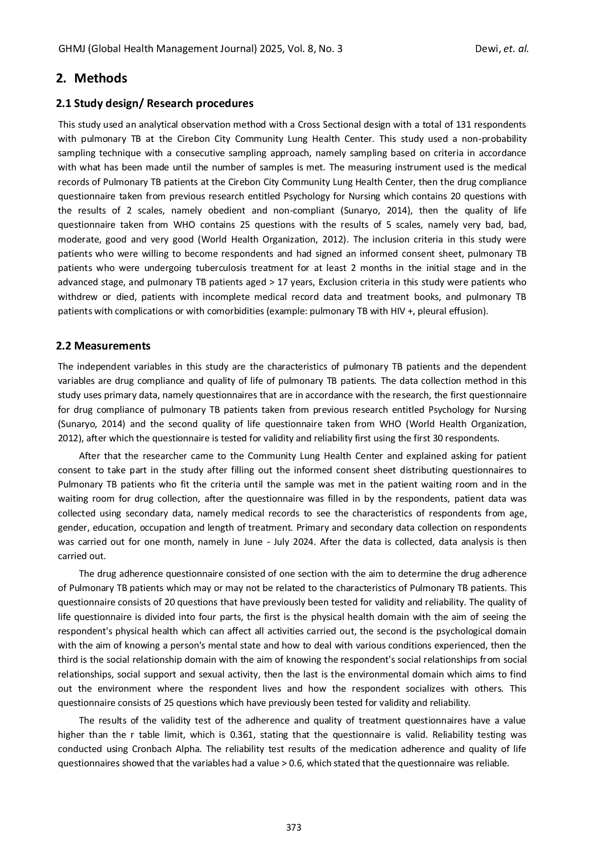 GHMJ (Global Health Management Journal)GHMJ (Global Health Management Journal)Background: Tuberculosis (TB) is one of the top ten causes of death worldwide, caused by the Mycobacterium tuberculosis germ. Adherence to medication is a key factor in successful treatment and efforts to improve the quality of life of TB patients. Aims: Analyzing the relationship between characteristics with medication adherence and quality of life of pulmonary TB patients at the Cirebon City Community Lung Health Center. Methods: This study used an analytic observation method with a Cross Sectional design. The measuring instruments used were medical records and questionnaires that had been tested for validity and reliability, with a total of 131 respondents of pulmonary TB patients at the Cirebon City Community Lung Health Center (BKPM). Results: The most common characteristics were adult age 90.8%, female gender 56.5%, secondary education 50.4%, student 28.2%, length of treatment at the advanced stage 59.5%, adherent to taking medication 87.0%, good quality of life 54.2%. Based on the Chi-Square test, the relationship between characteristics and drug compliance from age p-value=0.189, gender p-value=0.320, education p-value=0.447, occupation p-value=0.594, length of treatment p-value=0.014. The relationship between characteristics and quality of life from age p-value=0.688, gender p-value=0.550, education p-value=0.838, occupation p-value=0.519, length of treatment p-value=0.604. Based on the logistic regression test, the relationship between characteristics and drug compliance from age p-value=0.058, length of treatment p-value=0.006. Conclusion: There is no relationship between age, gender, education, and occupation with medication adherence (p>0.05). Whereas in the length of treatment there is a relationship with adherence to taking medication. There is no relationship between characteristics and quality of life of pulmonary TB patients (p>0.05). The characteristic most associated with adherence to taking medication is length of treatment (p=0.006). Future researchers are advised to explore other factors that may be related to medication adherence and quality of life in patients with pulmonary TB.
