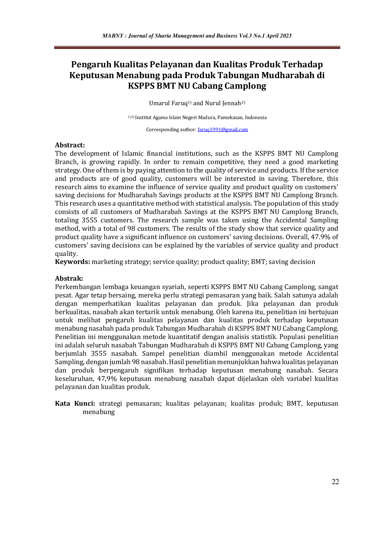 Mabny: Journal of Sharia Management and BusinessMabny: Journal of Sharia Management and BusinessPerkembangan lembaga keuangan syariah, seperti KSPPS BMT NU Cabang Camplong, sangat pesat. Agar tetap bersaing, mereka perlu strategi pemasaran yang baik. Salah satunya adalah dengan memperhatikan kualitas pelayanan dan produk. Jika pelayanan dan produk berkualitas, nasabah akan tertarik untuk menabung. Oleh karena itu, penelitian ini bertujuan untuk melihat pengaruh kualitas pelayanan dan kualitas produk terhadap keputusan menabung nasabah pada produk Tabungan Mudharabah di KSPPS BMT NU Cabang Camplong. Penelitian ini menggunakan metode kuantitatif dengan analisis statistik. Populasi penelitian ini adalah seluruh nasabah Tabungan Mudharabah di KSPPS BMT NU Cabang Camplong, yang berjumlah 3555 nasabah. Sampel penelitian diambil menggunakan metode Accidental Sampling, dengan jumlah 98 nasabah. Hasil penelitian menunjukkan bahwa kualitas pelayanan dan produk berpengaruh signifikan terhadap keputusan menabung nasabah. Secara keseluruhan, 47,9% keputusan menabung nasabah dapat dijelaskan oleh variabel kualitas pelayanan dan kualitas produk.