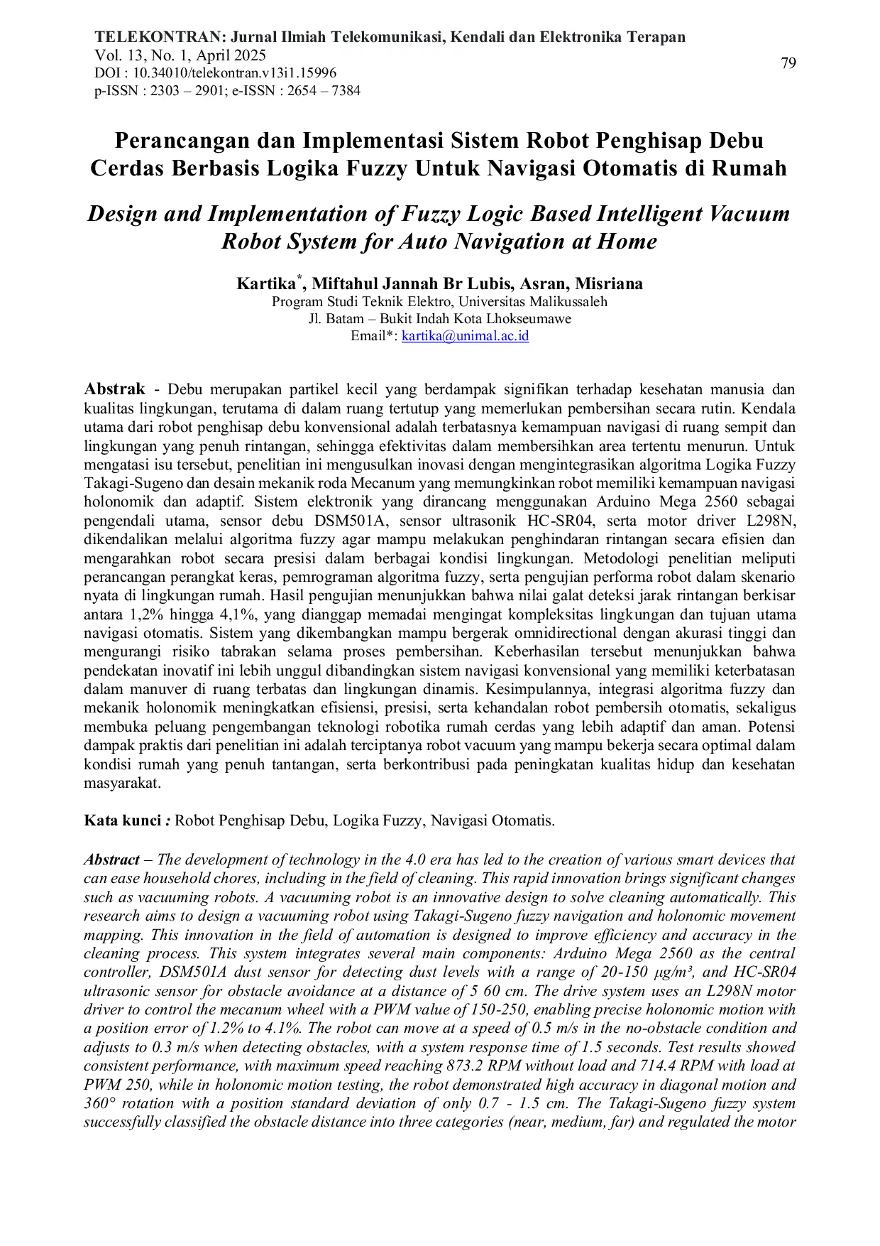 Telekontran : Jurnal Ilmiah Telekomunikasi, Kendali dan Elektronika TerapanTelekontran : Jurnal Ilmiah Telekomunikasi, Kendali dan Elektronika TerapanDebu merupakan partikel kecil yang berdampak signifikan terhadap kesehatan manusia dan kualitas lingkungan, terutama di dalam ruang tertutup yang memerlukan pembersihan secara rutin. Kendala utama dari robot penghisap debu konvensional adalah terbatasnya kemampuan navigasi di ruang sempit dan lingkungan yang penuh rintangan, sehingga efektivitas dalam membersihkan area tertentu menurun. Untuk mengatasi isu tersebut, penelitian ini mengusulkan inovasi dengan mengintegrasikan algoritma Logika Fuzzy Takagi‑Sugeno dan desain mekanik roda Mecanum yang memungkinkan robot memiliki kemampuan navigasi holonomik dan adaptif. Sistem elektronik yang dirancang menggunakan Arduino Mega 2560 sebagai pengendali utama, sensor debu DSM501A, sensor ultrasonik HC‑SR04, serta motor driver L298N, dikendalikan melalui algoritma fuzzy agar mampu melakukan penghindaran rintangan secara efisien dan mengarahkan robot secara presisi dalam berbagai kondisi lingkungan. Metodologi penelitian meliputi perancangan perangkat keras, pemrograman algoritma fuzzy, serta pengujian performa robot dalam skenario nyata di lingkungan rumah. Hasil pengujian menunjukkan bahwa nilai galat deteksi jarak rintangan berkisar antara 1,2% hingga 4,1%, yang dianggap memadai mengingat kompleksitas lingkungan dan tujuan utama navigasi otomatis. Sistem yang dikembangkan mampu bergerak omnidirectional dengan akurasi tinggi dan mengurangi risiko tabrakan selama proses pembersihan. Keberhasilan tersebut menunjukkan bahwa pendekatan inovatif ini lebih unggul dibandingkan sistem navigasi konvensional yang memiliki keterbatasan dalam manuver di ruang terbatas dan lingkungan dinamis. Kesimpulannya, integrasi algoritma fuzzy dan mekanik holonomik meningkatkan efisiensi, presisi, serta kehandalan robot pembersih otomatis, sekaligus membuka peluang pengembangan teknologi robotika rumah cerdas yang lebih adaptif dan aman.