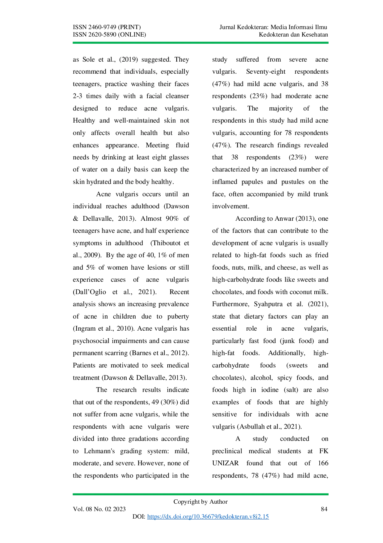 Kebiasaan makan mahasiswa preklinis Fakultas Kedokteran Universitas Islam Al-Azhar (FK UNIZAR) pada kohort 2019, 2020, dan 2021 umumnya termasuk dalam kategori buruk.Kejadian akne vulgaris pada mahasiswa preklinis FK UNIZAR lebih bersifat ringan.Berdasarkan analisis, tidak ditemukan hubungan signifikan antara pola makan dan kejadian akne vulgaris.Peneliti selanjutnya dapat merumuskan variabel lain dan meningkatkan jumlah serta variasi responden, sementara mahasiswa diharapkan menjaga kebiasaan makan yang baik dengan memperhatikan nutrisi yang cukup dan tidak melewatkan waktu makan.