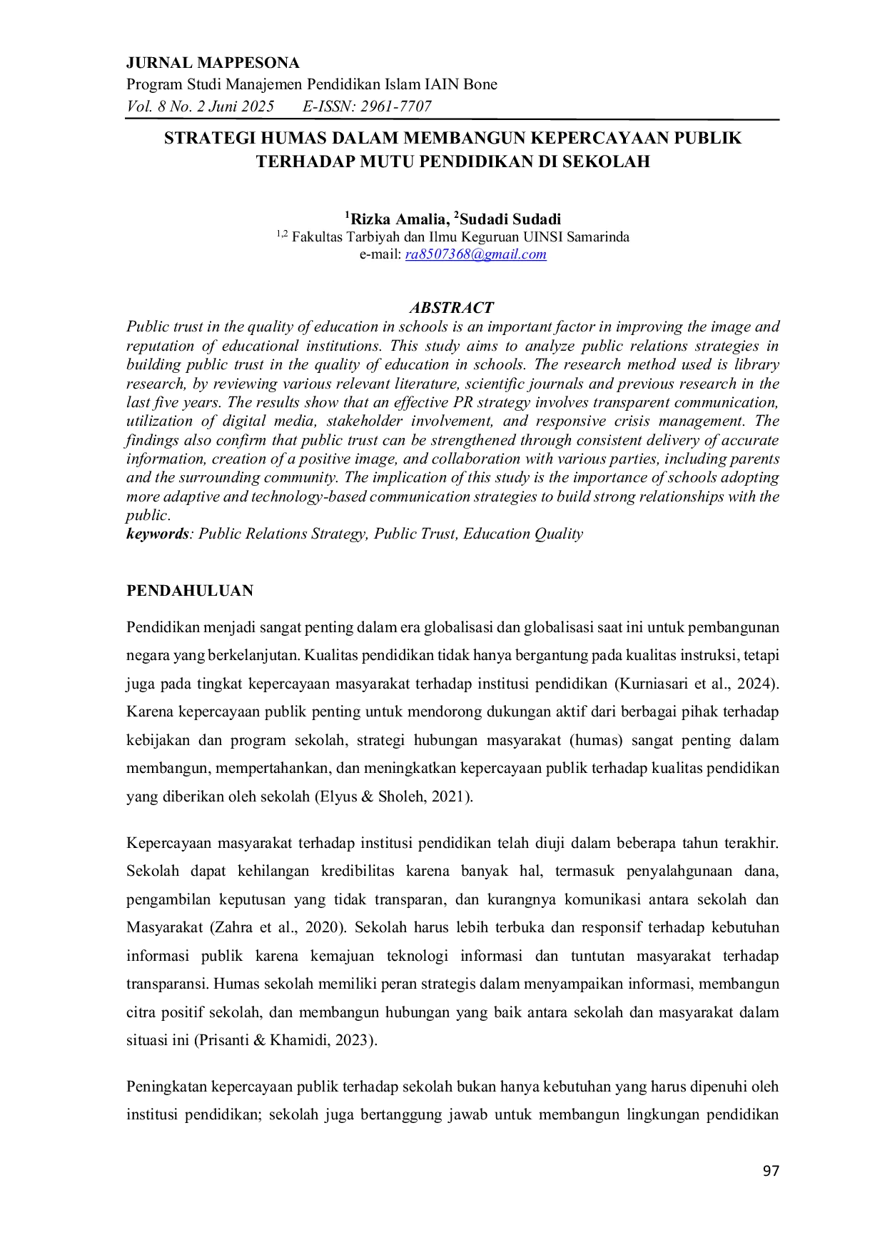 JURNAL MAPPESONAJURNAL MAPPESONAKepercayaan publik terhadap kualitas pendidikan di sekolah merupakan faktor penting dalam meningkatkan citra dan reputasi institusi pendidikan. Penelitian ini bertujuan untuk menganalisis strategi hubungan masyarakat dalam membangun kepercayaan publik terhadap kualitas pendidikan di sekolah. Metode penelitian yang digunakan adalah studi kepustakaan, dengan meninjau berbagai literatur yang relevan, jurnal ilmiah, dan penelitian sebelumnya dalam lima tahun terakhir. Hasil penelitian menunjukkan bahwa strategi PR yang efektif melibatkan komunikasi yang transparan, pemanfaatan media digital, keterlibatan pemangku kepentingan, dan manajemen krisis yang responsif. Temuan ini juga mengkonfirmasi bahwa kepercayaan publik dapat diperkuat melalui penyampaian informasi yang akurat secara konsisten, penciptaan citra positif, dan kolaborasi dengan berbagai pihak, termasuk orang tua dan masyarakat sekitar. Implikasi dari penelitian ini adalah pentingnya sekolah mengadopsi strategi komunikasi yang lebih adaptif dan berbasis teknologi untuk membangun hubungan yang kuat dengan publik.