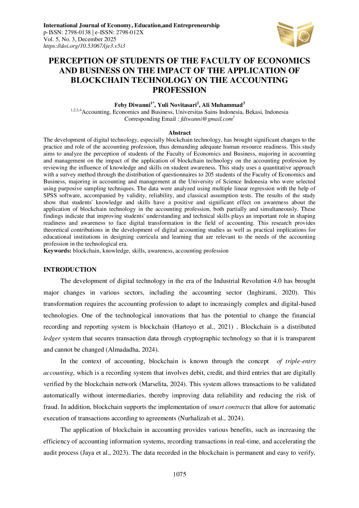 International Journal of Economy, Education and Entrepreneurship (IJE3)International Journal of Economy, Education and Entrepreneurship (IJE3)Pengembangan teknologi digital, terutama teknologi blockchain, telah membawa perubahan signifikan dalam praktik dan peran profesi akuntansi, sehingga menuntut kesiapan sumber daya manusia yang memadai. Studi ini bertujuan untuk menganalisis persepsi mahasiswa Fakultas Ekonomi dan Bisnis, yang mengambil jurusan akuntansi dan manajemen, tentang dampak penerapan teknologi blockchain terhadap profesi akuntansi dengan meninjau pengaruh pengetahuan dan keterampilan terhadap kesadaran mahasiswa. Studi ini menggunakan pendekatan kuantitatif dengan metode survei melalui penyebaran kuesioner kepada 205 mahasiswa Fakultas Ekonomi dan Bisnis, yang mengambil jurusan akuntansi dan manajemen di Universitas Sains Indonesia yang dipilih menggunakan teknik purposive sampling. Data dianalisis menggunakan regresi linear berganda dengan bantuan perangkat lunak SPSS, disertai dengan uji validitas, reliabilitas, dan uji asumsi klasik. Hasil penelitian menunjukkan bahwa pengetahuan dan keterampilan mahasiswa memiliki pengaruh positif dan signifikan terhadap kesadaran tentang penerapan teknologi blockchain dalam profesi akuntansi, baik secara parsial maupun simultan. Temuan ini mengindikasikan bahwa peningkatan pemahaman dan keterampilan teknis mahasiswa memainkan peran penting dalam membentuk kesiapan dan kesadaran untuk menghadapi transformasi digital di bidang akuntansi. Penelitian ini memberikan kontribusi teoretis dalam pengembangan studi akuntansi digital serta implikasi praktis bagi lembaga pendidikan dalam merancang kurikulum dan pembelajaran yang relevan dengan kebutuhan profesi akuntansi di era teknologi.