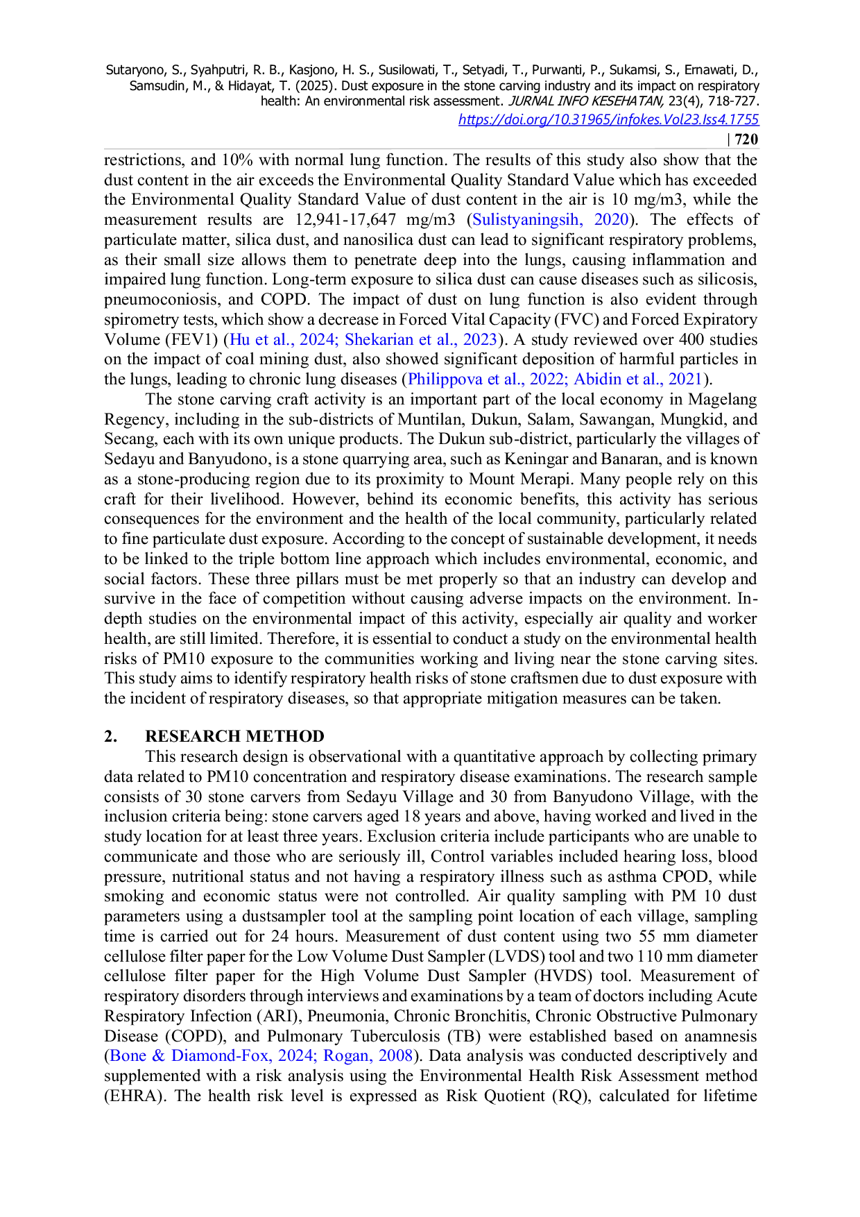 JURNAL INFO KESEHATANJURNAL INFO KESEHATANPenambangan dan pengolahan batu di Kabupaten Magelang memiliki potensi besar untuk meningkatkan kesejahteraan masyarakat melalui pengembangan industri dan pariwisata, tetapi juga menimbulkan risiko kesehatan akibat paparan debu PM10 yang melebihi batas aman. Penelitian ini bertujuan untuk mengidentifikasi risiko kesehatan pernapasan para pengrajin batu akibat paparan debu dengan kejadian penyakit pernapasan, menggunakan pendekatan kuantitatif dengan pengamatan dan pengumpulan data primer dari 60 responden. Tingkat debu diukur menggunakan LVDS dan HVDS, sedangkan prevalensi Infeksi Saluran Pernapasan Akut (ISPA) ditentukan melalui pemeriksaan kesehatan. Analisis Risiko Kesehatan Lingkungan (ARKL) dengan Kuotien Risiko (RQ) diterapkan untuk mengevaluasi paparan jangka panjang. Hasil menunjukkan konsentrasi debu sebesar 12,941 mg/m³ di Sedayu dan 17,647 mg/m³ di Banyudono, keduanya melebihi ambang batas, dengan gangguan pernapasan lebih tinggi di Sedayu (53,3%) daripada di Banyudono (33,3%). Nilai RQ di atas 1 di kedua desa menunjukkan risiko kesehatan yang signifikan, yang menekankan kebutuhan akan penggunaan APD yang lebih baik, ventilasi, pemeriksaan kualitas udara rutin, dan pemantauan kesehatan untuk mencegah masalah pernapasan.