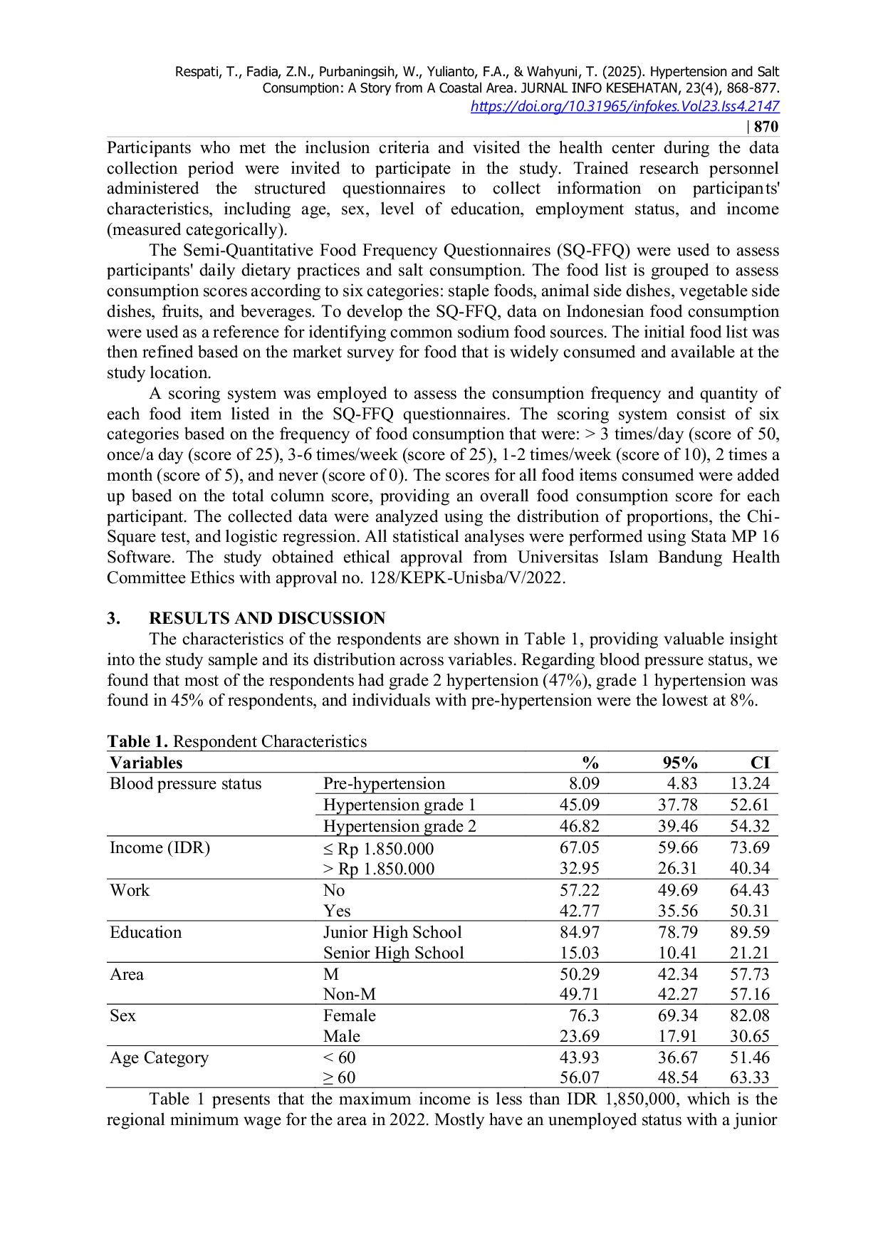 JURNAL INFO KESEHATANJURNAL INFO KESEHATANIndonesia has a high prevalence of hypertension accompanied by relatively high salt consumption, posing a significant public health concern, particularly in coastal areas where salty foods and saline water are commonly available. This study aimed to analyze the relationship between salt consumption and hypertension grade among residents in a coastal area. A cross-sectional study was conducted involving 174 hypertensive patients in Pangandaran District who had recorded blood pressure measurements at the local health center. Data on respondents characteristics, including age, sex, education level, occupation, and income, were collected. Salt intake was assessed using a Semi-Quantitative Food Frequency Questionnaire (SQ-FFQ). Multiple logistic regression analysis was performed to examine the association between salt consumption and hypertension grade while controlling for potential confounding variables. The mean sodium intake among respondents was 1312.11 ± 596.27 mg/day. Salt consumption was significantly associated with hypertension grade (β = 0.001; p = 0.004) after adjustment for education level and type of occupation. In conclusion, higher salt consumption is significantly associated with increased severity of hypertension in coastal populations, highlighting the need for targeted dietary interventions to reduce salt intake in these areas.