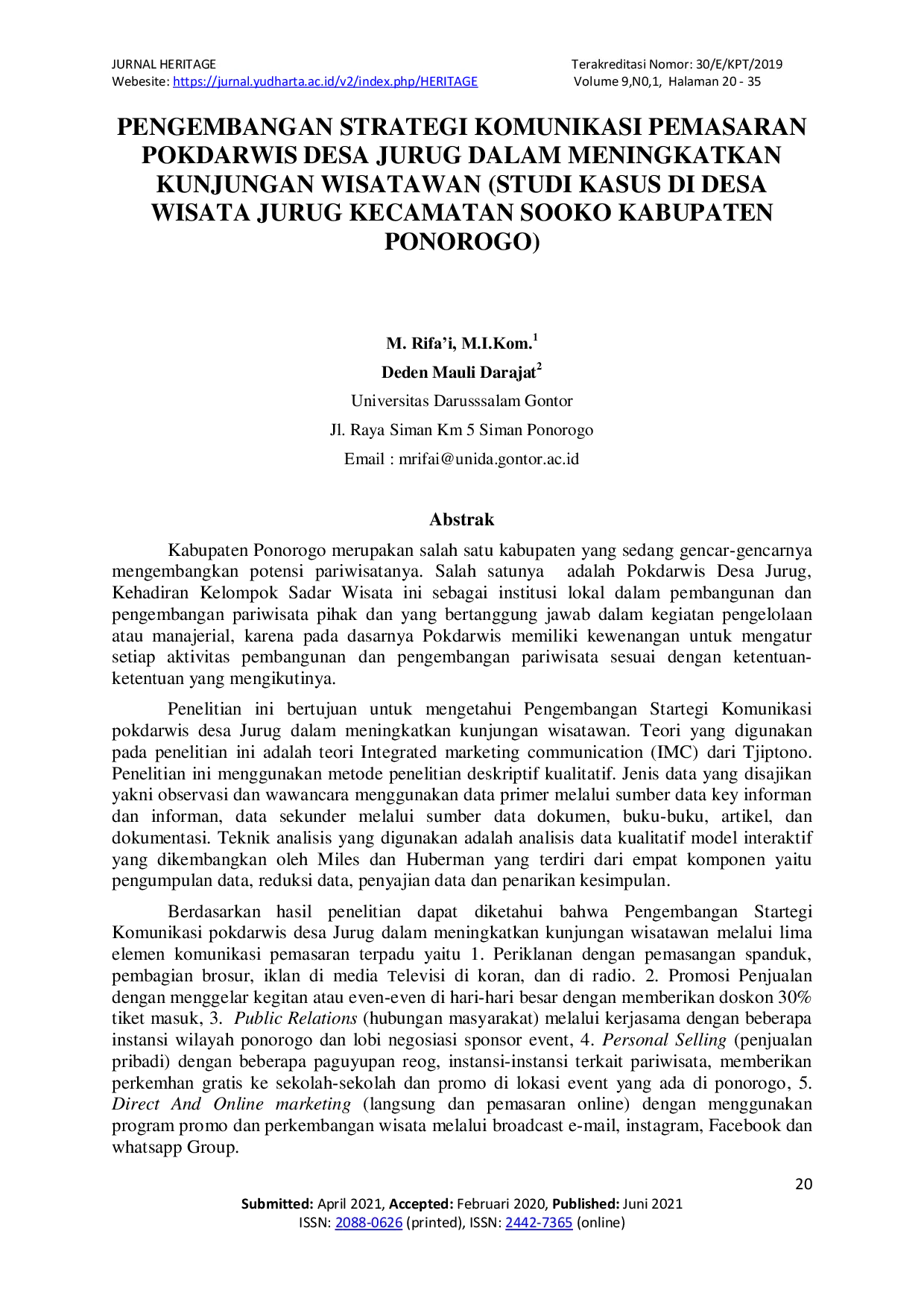 JURNAL HERITAGEJURNAL HERITAGEKabupaten Ponorogo sedang gencar mengembangkan potensi pariwisatanya, salah satunya melalui Pokdarwis Desa Jurug. Pokdarwis memiliki peran penting dalam pembangunan dan pengelolaan pariwisata. Penelitian ini bertujuan untuk mengetahui pengembangan strategi komunikasi Pokdarwis Desa Jurug dalam meningkatkan kunjungan wisatawan. Teori yang digunakan adalah teori Integrated Marketing Communication (IMC) dari Tjiptono. Penelitian ini menggunakan metode penelitian deskriptif kualitatif dengan data primer melalui observasi dan wawancara, serta data sekunder melalui dokumen, buku, artikel, dan dokumentasi. Analisis data menggunakan model interaktif Miles dan Huberman. Hasil penelitian menunjukkan bahwa pengembangan strategi komunikasi Pokdarwis Desa Jurug melibatkan lima elemen komunikasi pemasaran terpadu: periklanan, promosi penjualan, public relations, personal selling, dan direct and online marketing.
