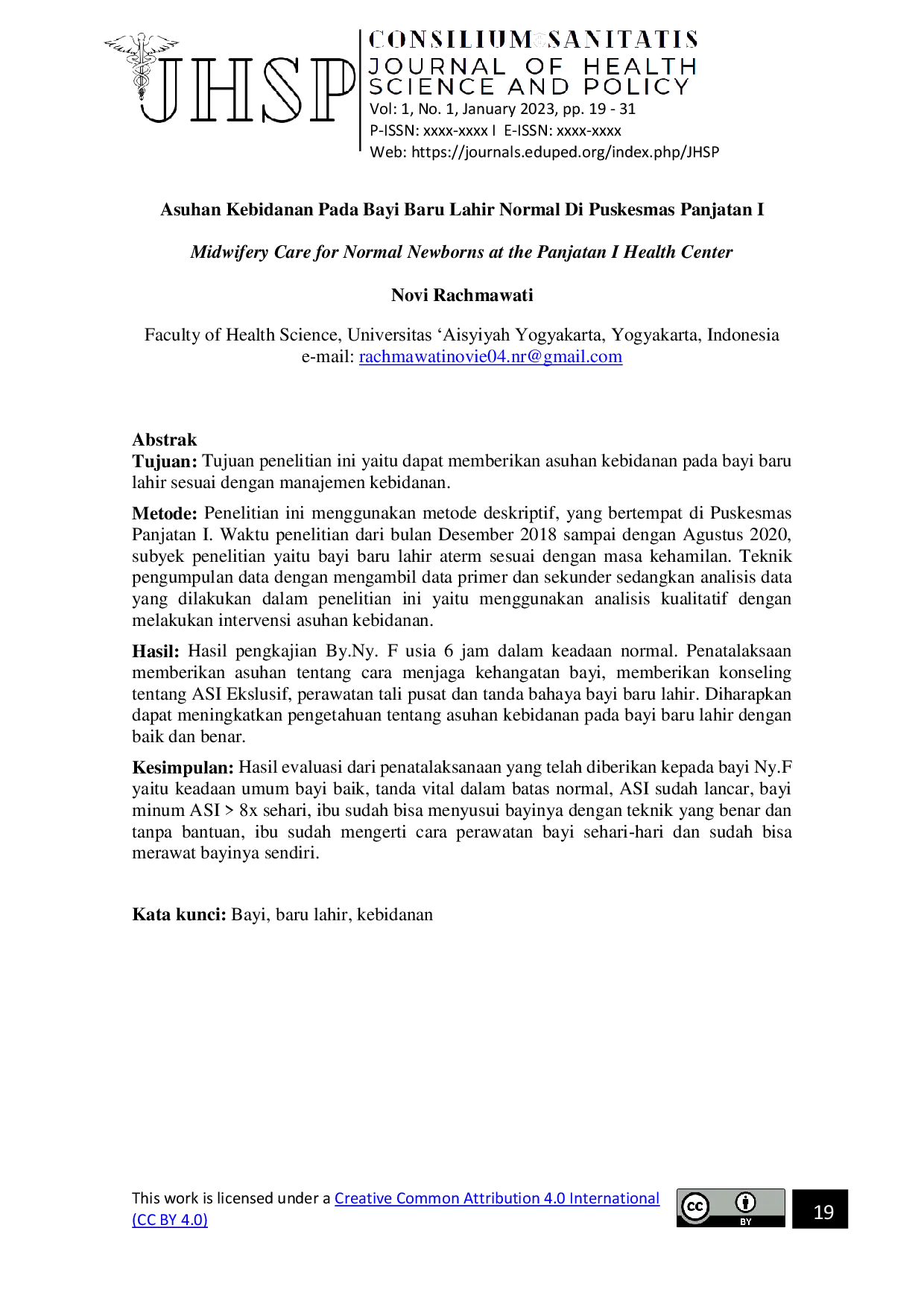 Consilium Sanitatis: Journal of Health Science and PolicyConsilium Sanitatis: Journal of Health Science and PolicyTujuan: Tujuan penelitian ini yaitu dapat memberikan asuhan kebidanan pada bayi baru lahir sesuai dengan manajemen kebidanan. Metode: Penelitian ini menggunakan metode deskriptif, yang bertempat di Puskesmas Panjatan I. Waktu penelitian dari bulan Desember 2018 sampai dengan Agustus 2020, subyek penelitian yaitu bayi baru lahir aterm sesuai dengan masa kehamilan. Teknik pengumpulan data dengan mengambil data primer dan sekunder sedangkan analisis data yang dilakukan dalam penelitian ini yaitu menggunakan analisis kualitatif dengan melakukan intervensi asuhan kebidanan. Hasil: Hasil pengkajian By.Ny. F usia 6 jam dalam keadaan normal. Penatalaksanaan memberikan asuhan tentang cara menjaga kehangatan bayi, memberikan konseling tentang ASI Ekslusif, perawatan tali pusat dan tanda bahaya bayi baru lahir. Diharapkan dapat meningkatkan pengetahuan tentang asuhan kebidanan pada bayi baru lahir dengan baik dan benar.