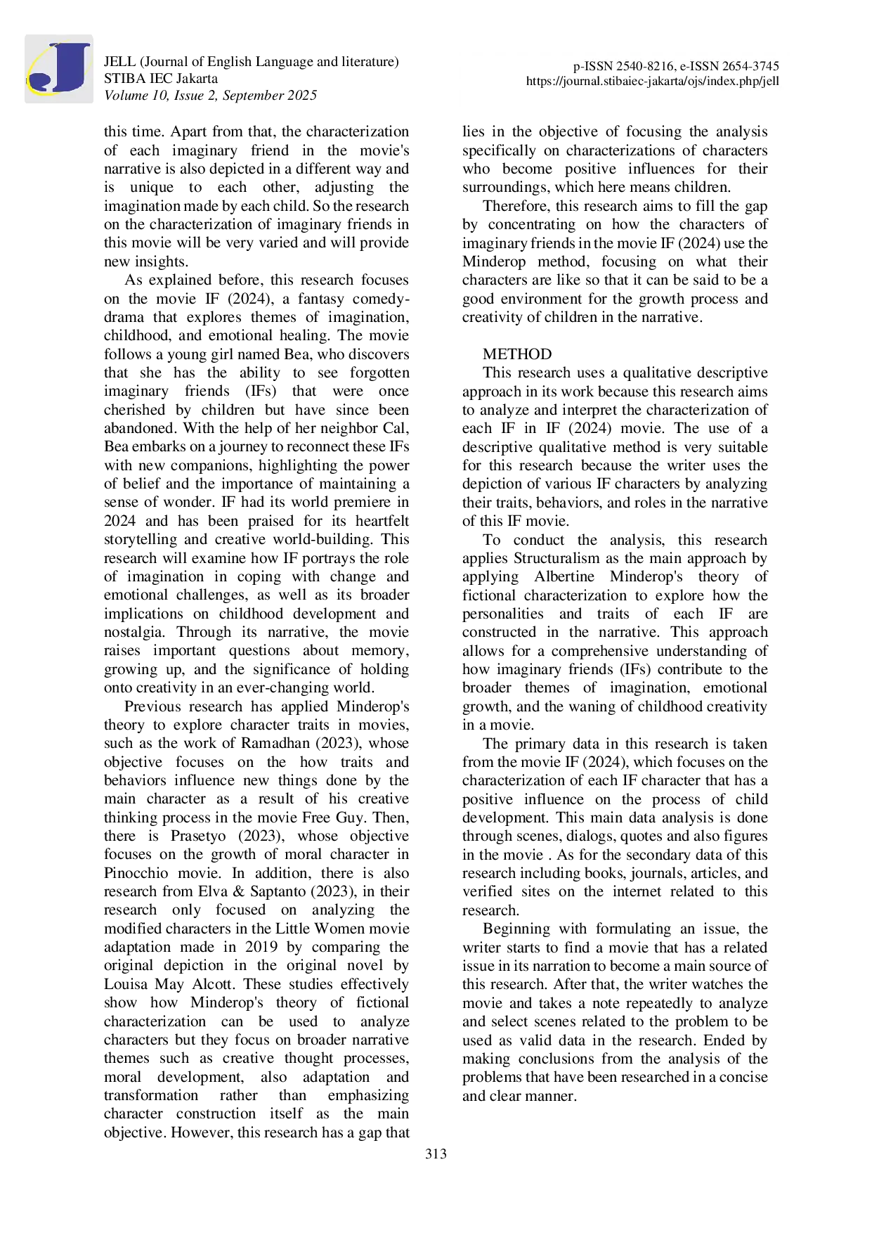 JELL (Journal of English Language and Literature) STIBA-IEC JakartaJELL (Journal of English Language and Literature) STIBA-IEC JakartaImaginasi memainkan peran penting dalam perkembangan masa kanak‑kanak, sering kali diwujudkan melalui teman imajiner sebagai pendamping emosional dan kognitif. Film IF (2024) menyajikan narasi unik yang memvisualisasikan teman imajiner anak‑anak serta makna mendalamnya. Penelitian ini bertujuan menganalisis karakterisasi teman imajiner. Dengan pendekatan kualitatif deskriptif, penelitian ini menerapkan teori karakterisasi fiksi Albertine Minderop untuk menelaah bagaimana tiap teman imajiner diproyeksikan melalui nama dan dialog. Data dikumpulkan melalui observasi adegan film, interaksi karakter, dan dialog. Temuan menunjukkan bahwa teman imajiner bukan sekadar entitas fiktif melainkan representasi emosional dari perasaan tak terungkap seperti duka, kesepian, dan kekuatan batin. Penelitian menyimpulkan bahwa IF (2024) memberikan representasi mendalam tentang bagaimana teman imajiner dapat mendampingi perjalanan psikologis anak, menjembatani kreativitas, pertumbuhan emosional, dan proses melepaskan diri.