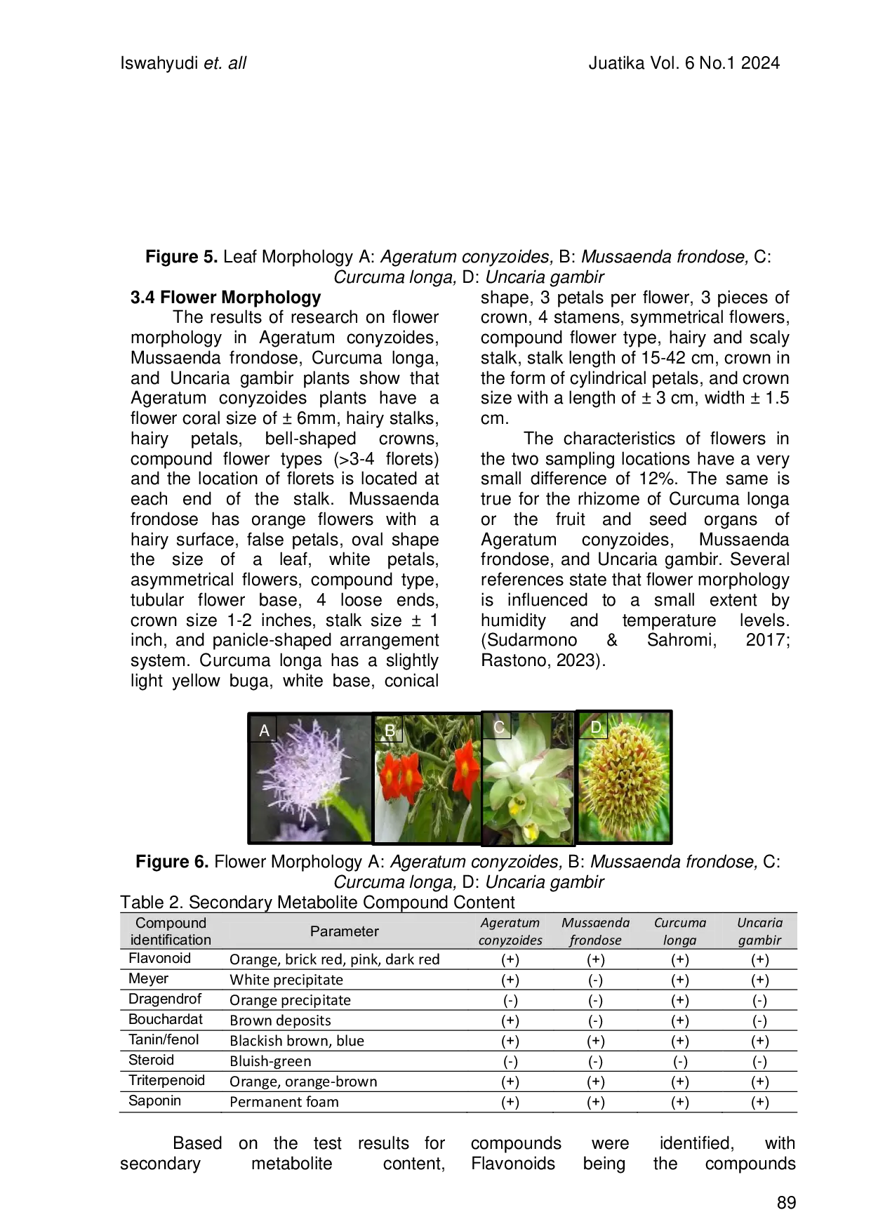 Penelitian menunjukkan bahwa tanaman obat Ageratum conyzoides, Mussaenda frondosa, Curcuma longa, dan Uncaria gambir memiliki kesamaan morfologi dan kandungan metabolit sekunder yang menjadikan mereka berpotensi serupa untuk terapi infeksi pascapersalinan, meski terdapat variasi yang dipengaruhi oleh faktor lingkungan seperti kondisi tanah dan ketinggian.Analisis senyawa seperti flavonoid, tanin/fenol, alkaloid, triterpenoid, dan saponin mengkonfirmasi nilai farmakologis tanaman tersebut.Namun, penggunaan berkelanjutan memerlukan pertimbangan dampak ekologi dan strategi konservasi.