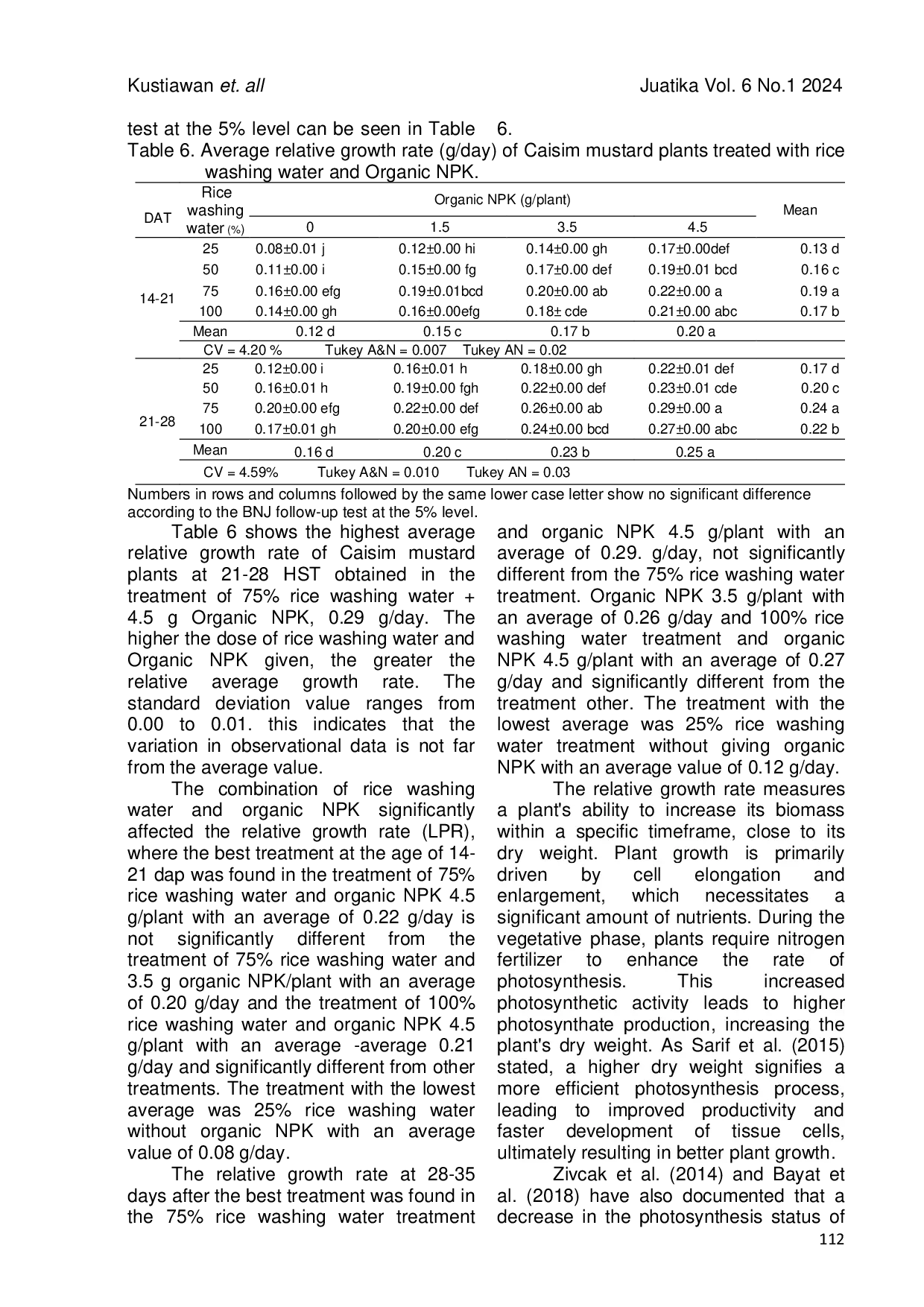 Kombinasi air cucian beras dan pupuk organik NPK secara signifikan memengaruhi semua parameter yang diamati.Perlakuan terbaik adalah penggunaan 75% air cucian beras dan pemberian 4.5 g pupuk organik NPK per tanaman.Penerapan air cucian beras secara signifikan memengaruhi semua parameter yang diamati, dengan perlakuan terbaik menggunakan 75% air cucian beras.Penerapan pupuk organik NPK secara signifikan memengaruhi semua parameter yang diamati, dengan perlakuan terbaik melibatkan pemberian 4.5 g pupuk organik NPK per tanaman.